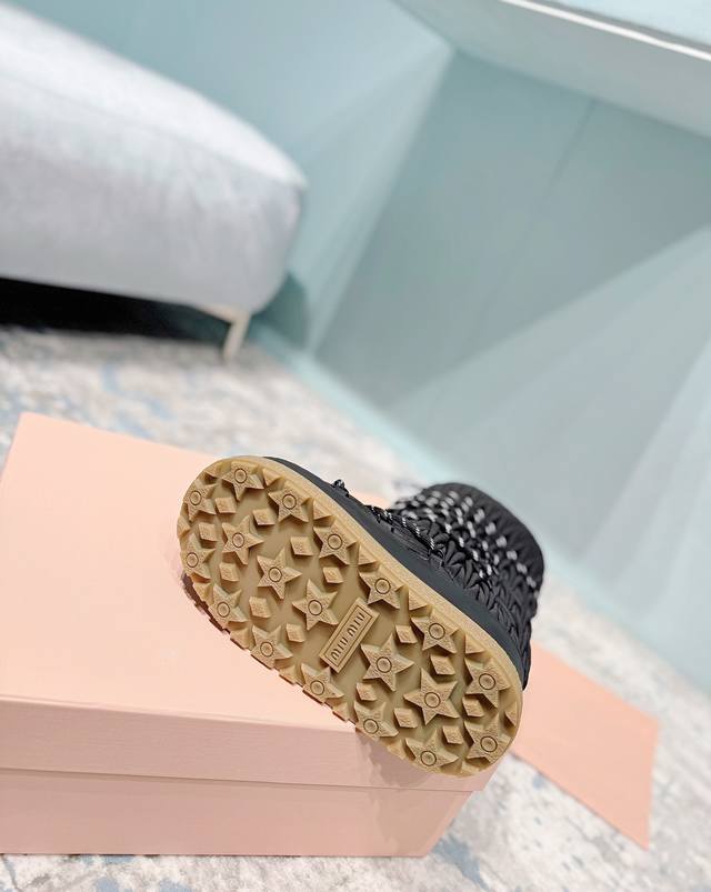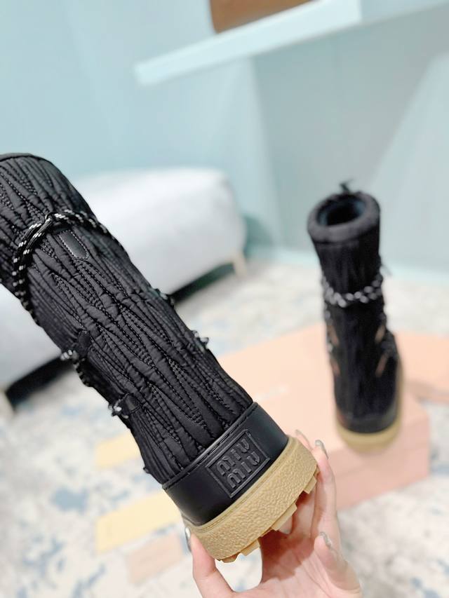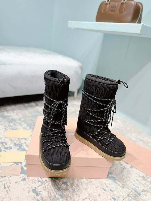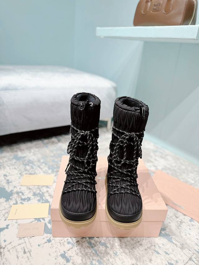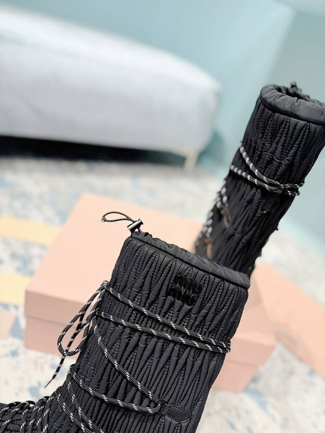 高版本 Miumiu缪缪24Ss系列,女士徽标尼龙华达呢雪地派对金属标双色厚底收缩系带羽绒雪地靴滑雪靴胖头靴!