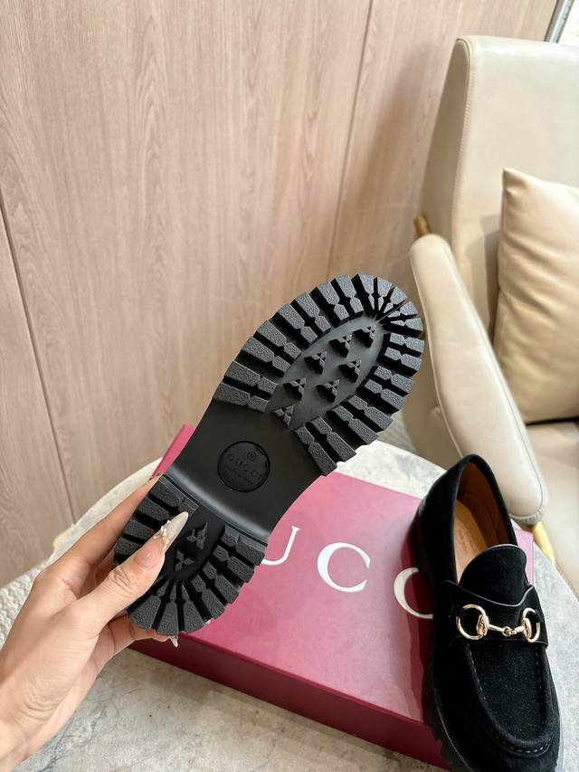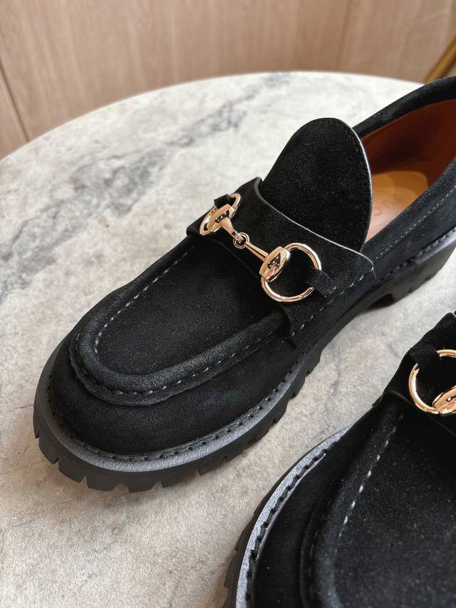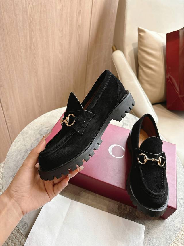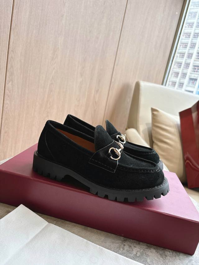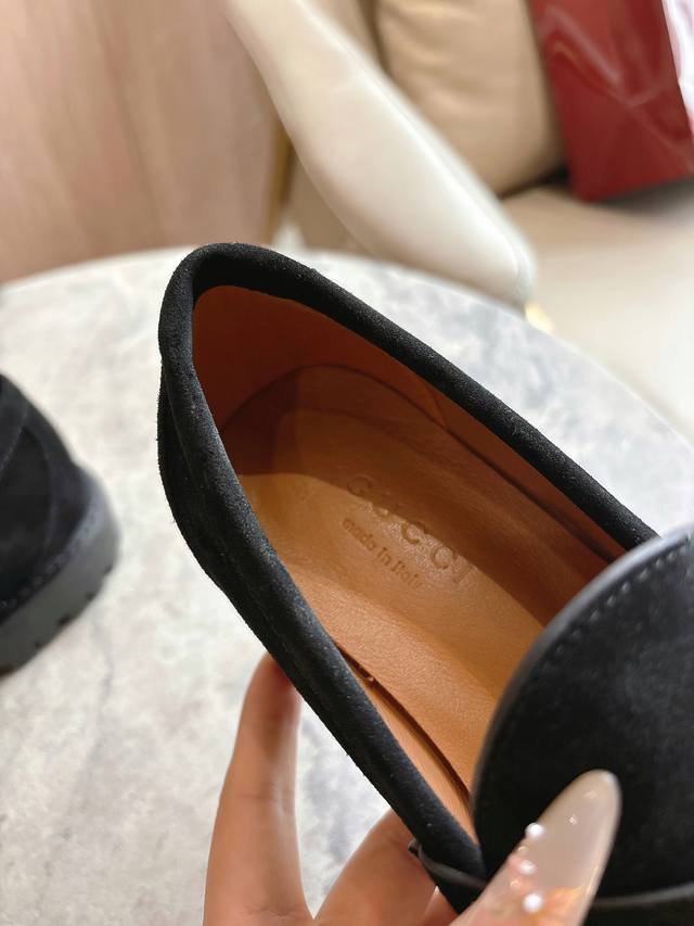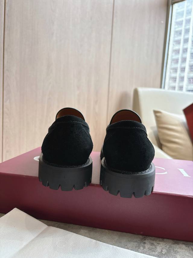 0453-8 黑 35-42 精巧细节为这款乐福鞋注入优雅气息。以光滑绒面材质精心打造,搭配沟纹橡胶鞋底,令整款设计更添魅力。浅金色调马衔扣为这款经典而不失现代风范的设计注入品牌标识内涵。