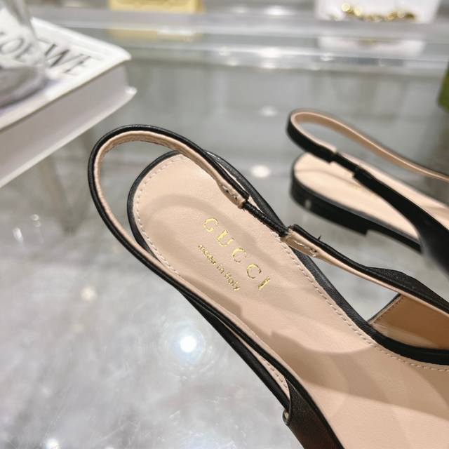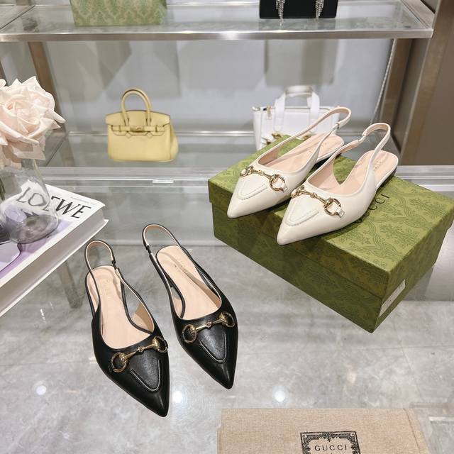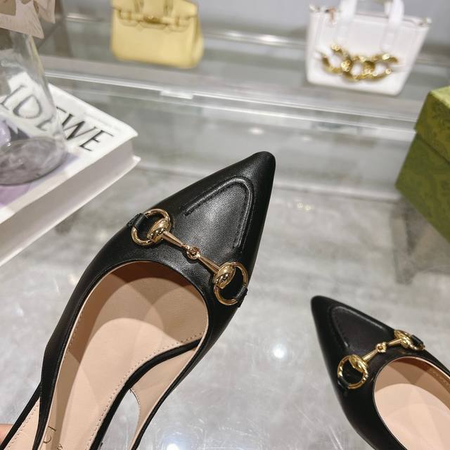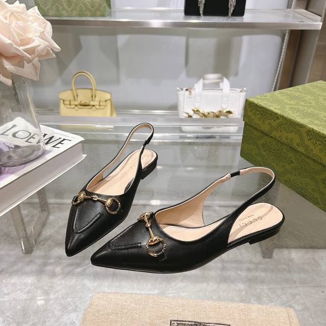 / 2024-4女 黑 35-41 这款单品出自gucci Lido系列,设计灵感源自意大利海岸的夏日风情和海滩俱乐部 黑色皮革女士金色调配件马衔扣尖形鞋头皮革鞋底