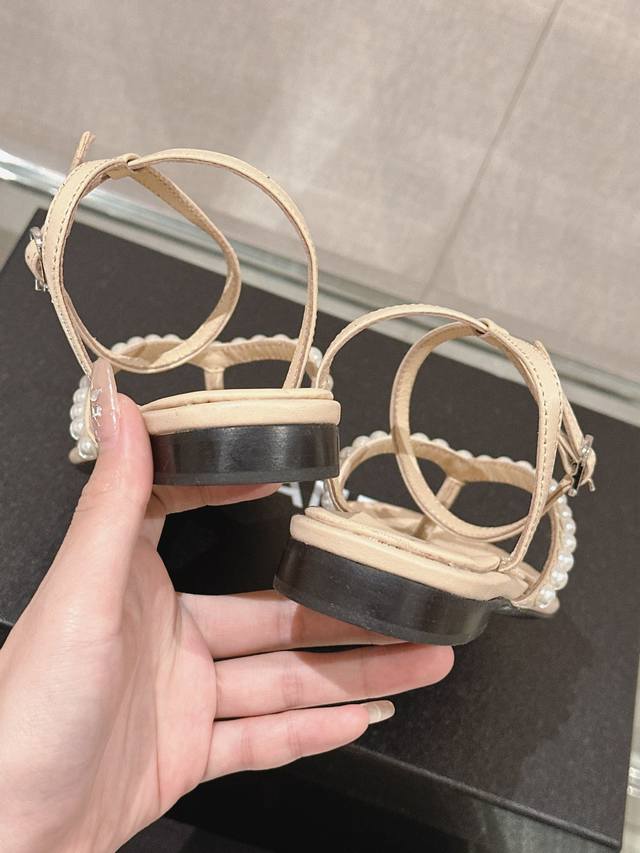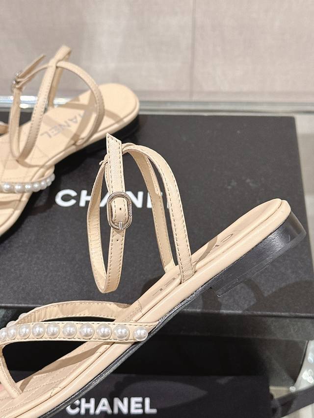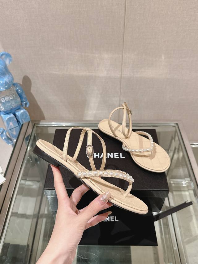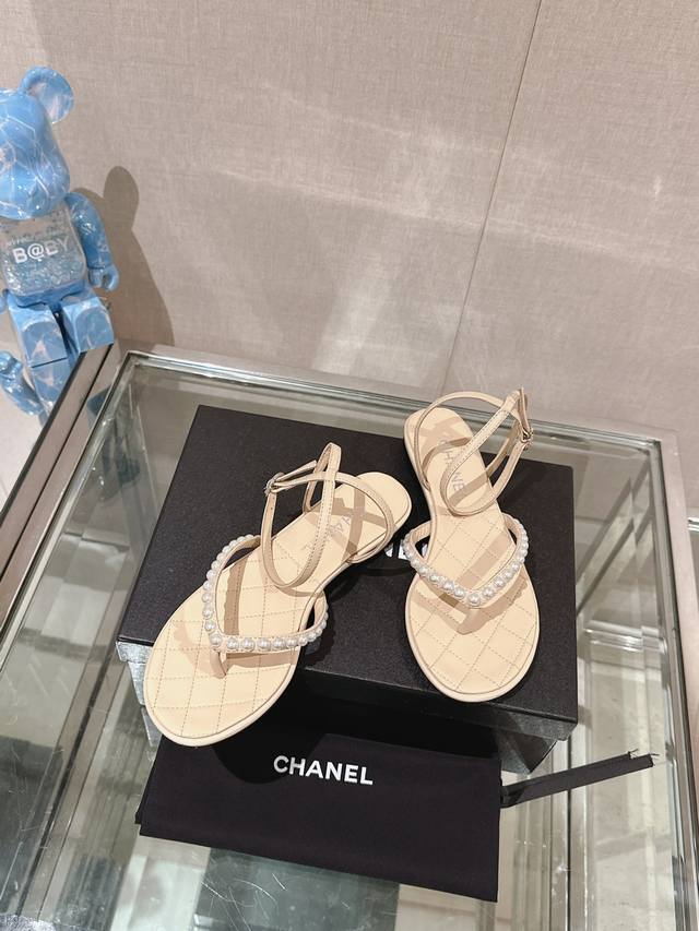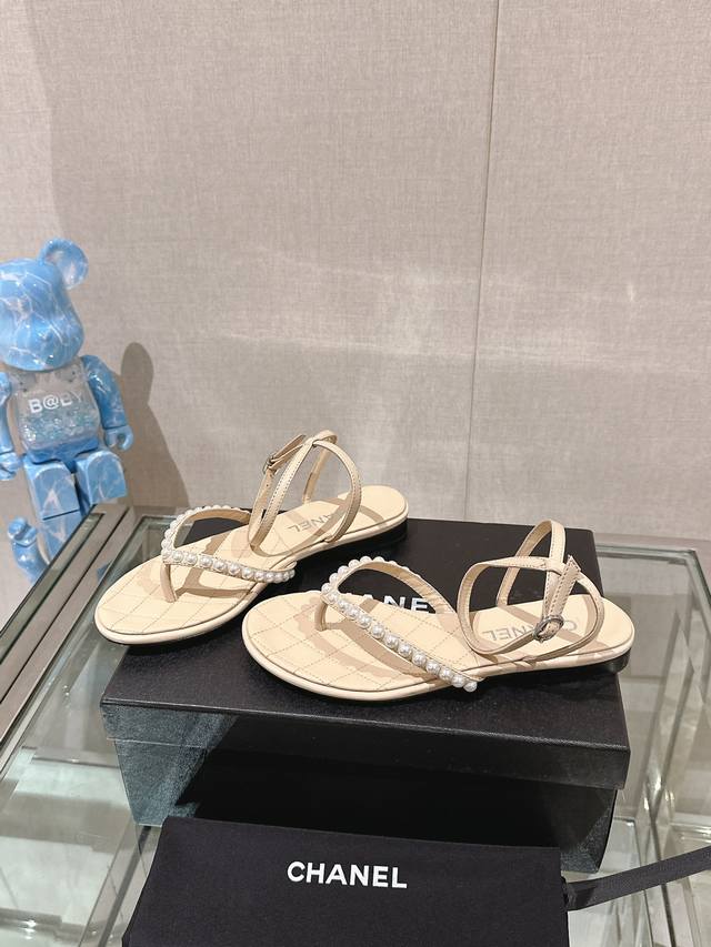 24Ss夏季新款chane*小香珍珠人字夹脚平底凉鞋