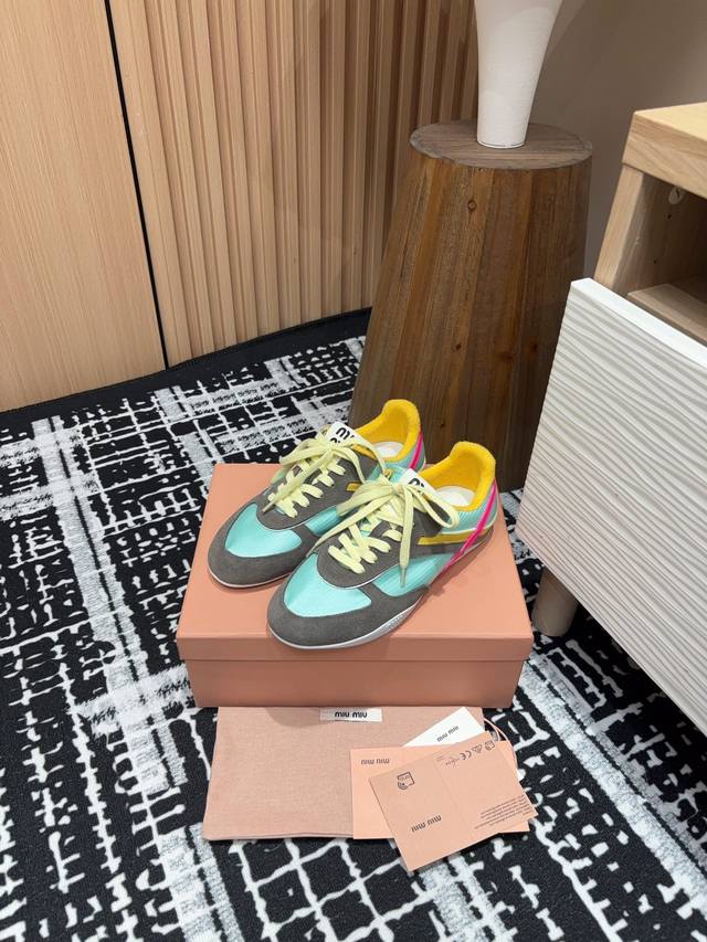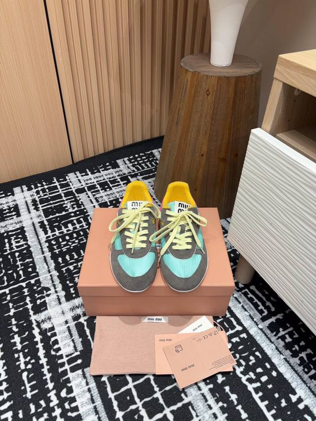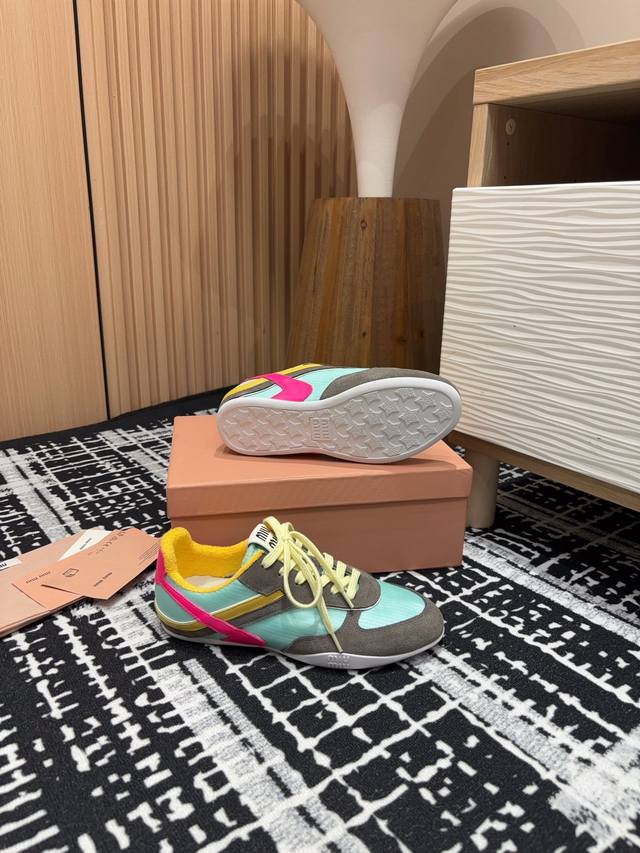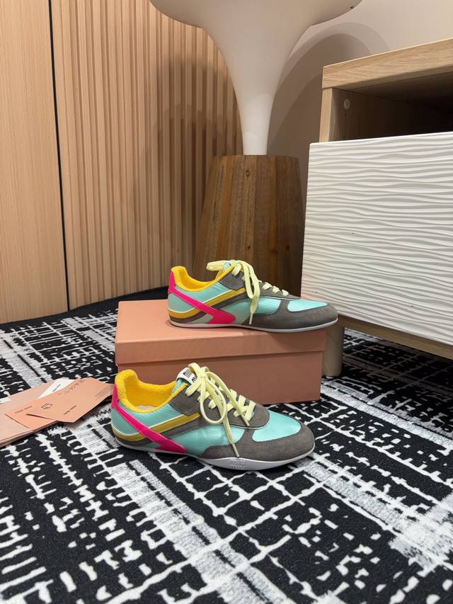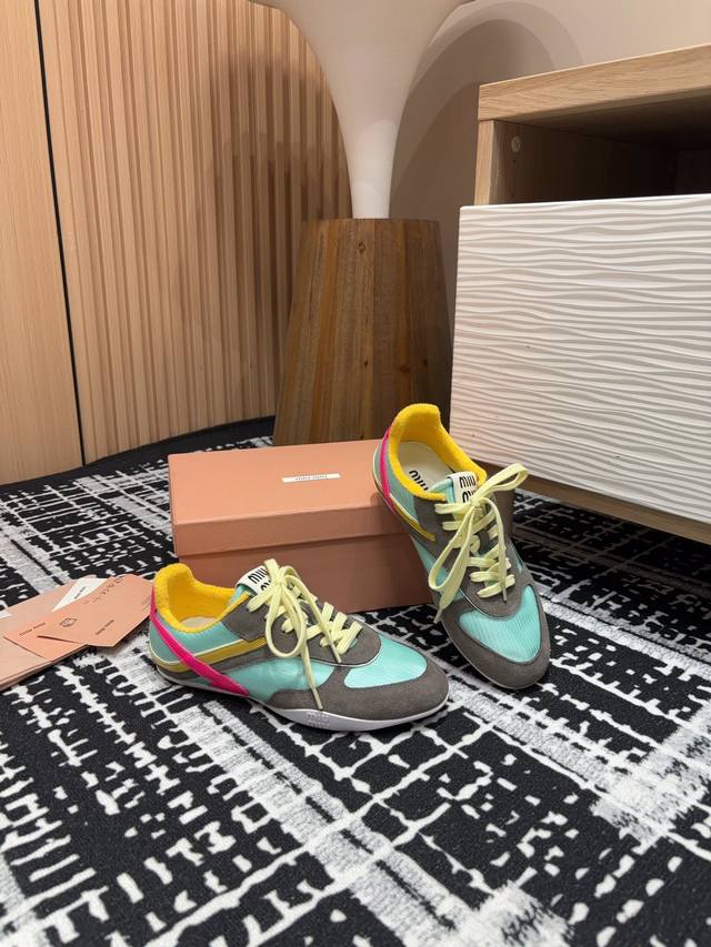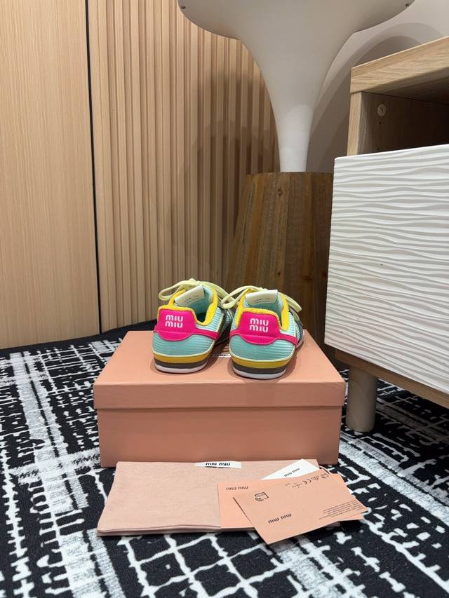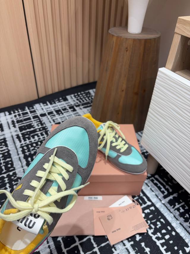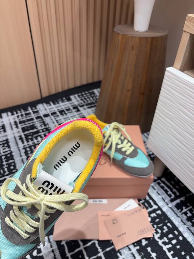 / 24Ss新款miu Miu系带休闲布鞋 前卫大胆的miu Mi*风格融于此款运动鞋的简约线条。别致徽标饰于鞋舌点缀复古设计。 鞋面:原版网布 内里:毛巾绒内里