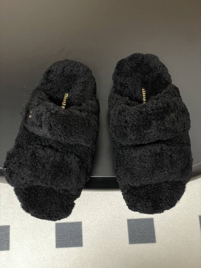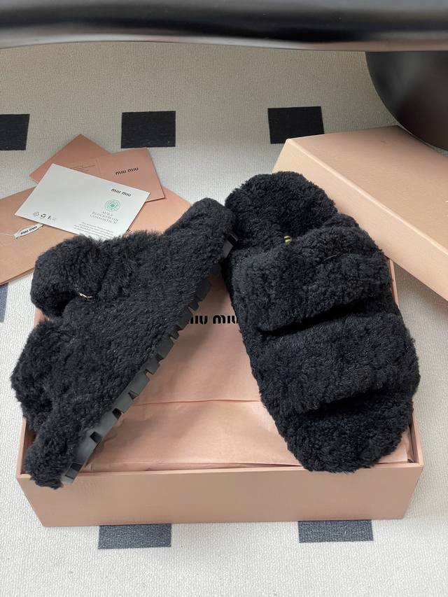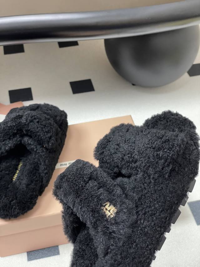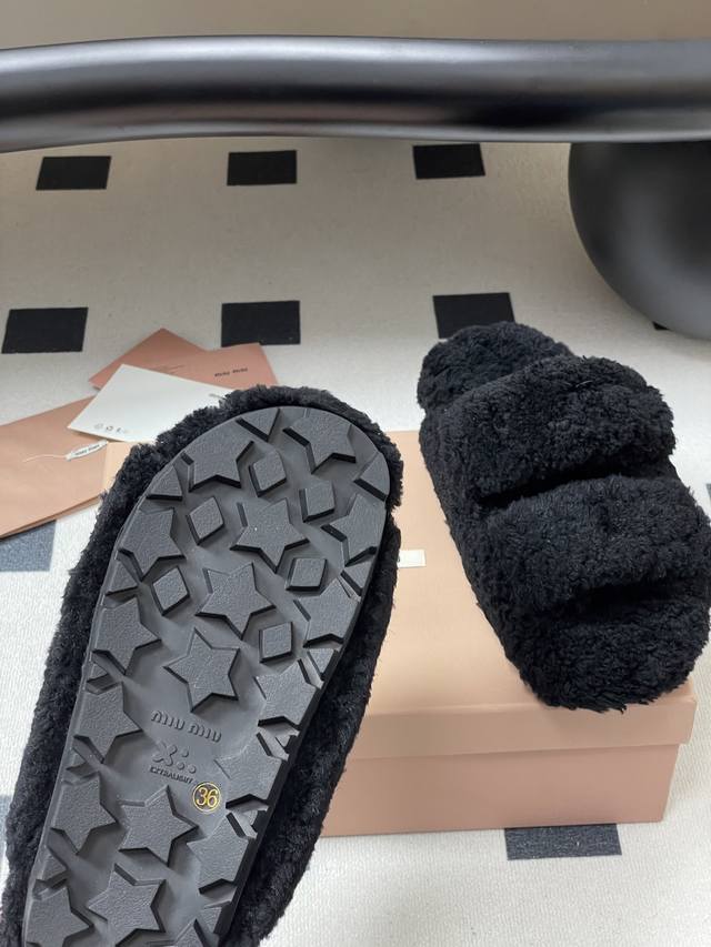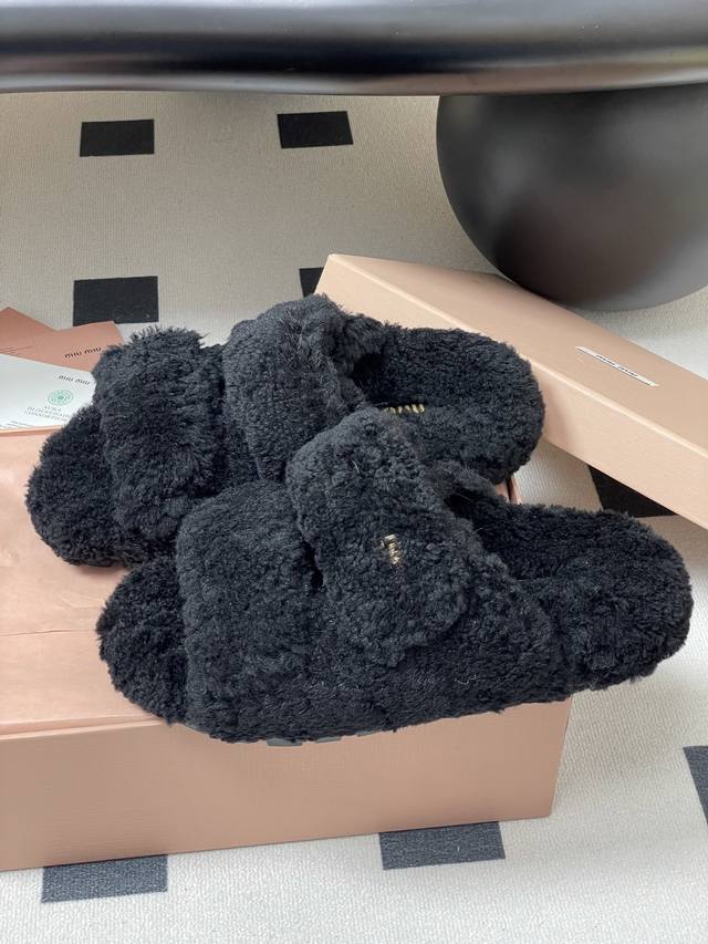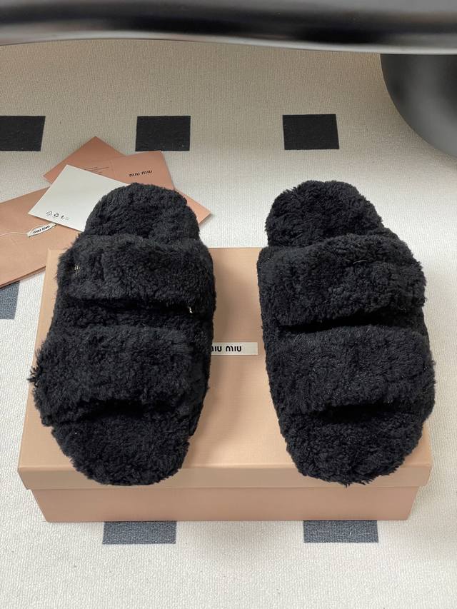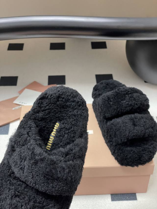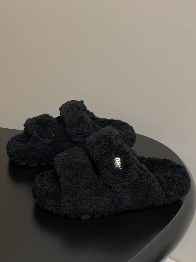 25Ss秋冬新款Miu Miu 缪缪 两带魔术贴厚底凉拖鞋毛毛拖鞋厚底毛毛鞋
