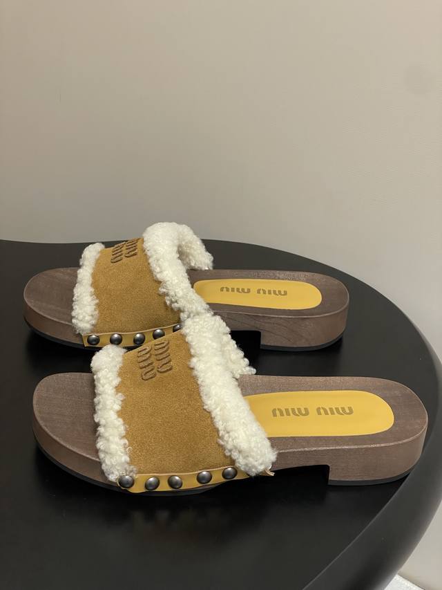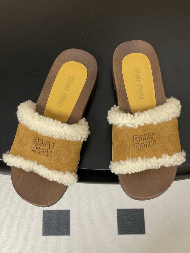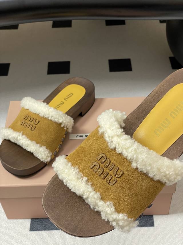 25Ss秋冬走秀款Miumiu 缪缪 实木底一字带羊毛拖鞋厚底毛拖鞋