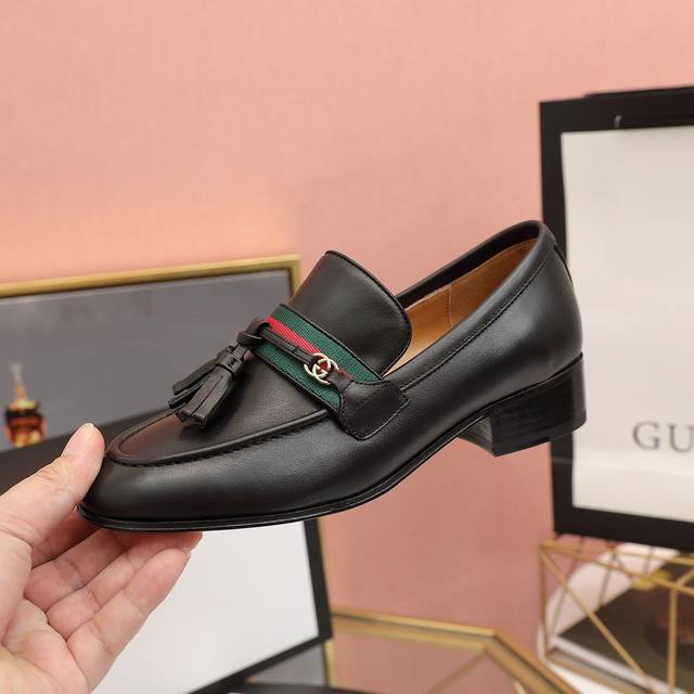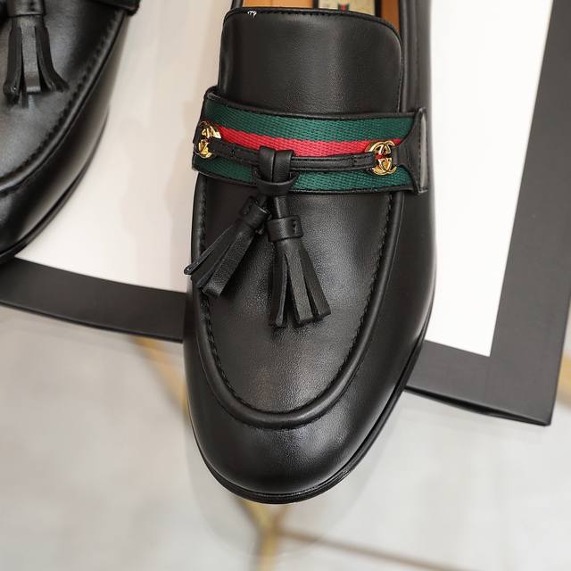 6243黑 ,35-40码. 意大利原板楦头。意大利制作工艺,原版意大利真皮大底[内配合格证/布袋/手提袋等全套包装] 这款女士乐福鞋采用黑色光面皮革制作而成,鞋头略微加长,并将流苏等传统细节与条纹织带和闪亮互扣式双g配件等品牌元素出色融为一体