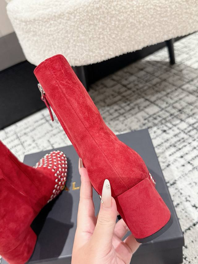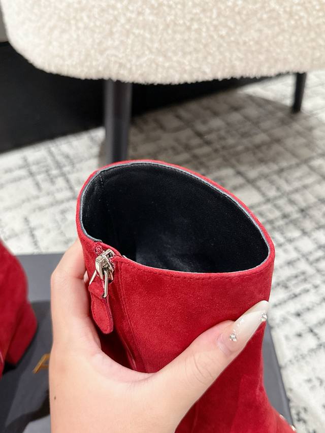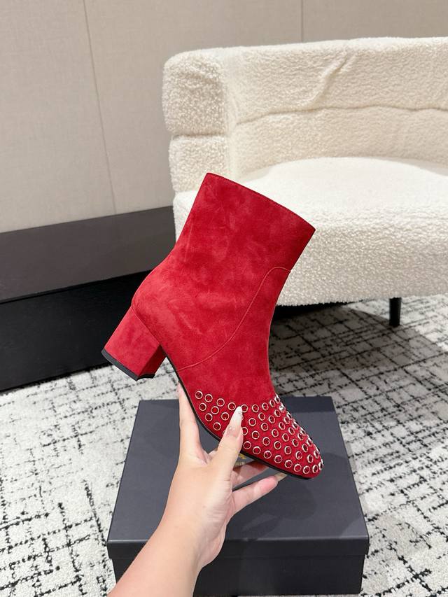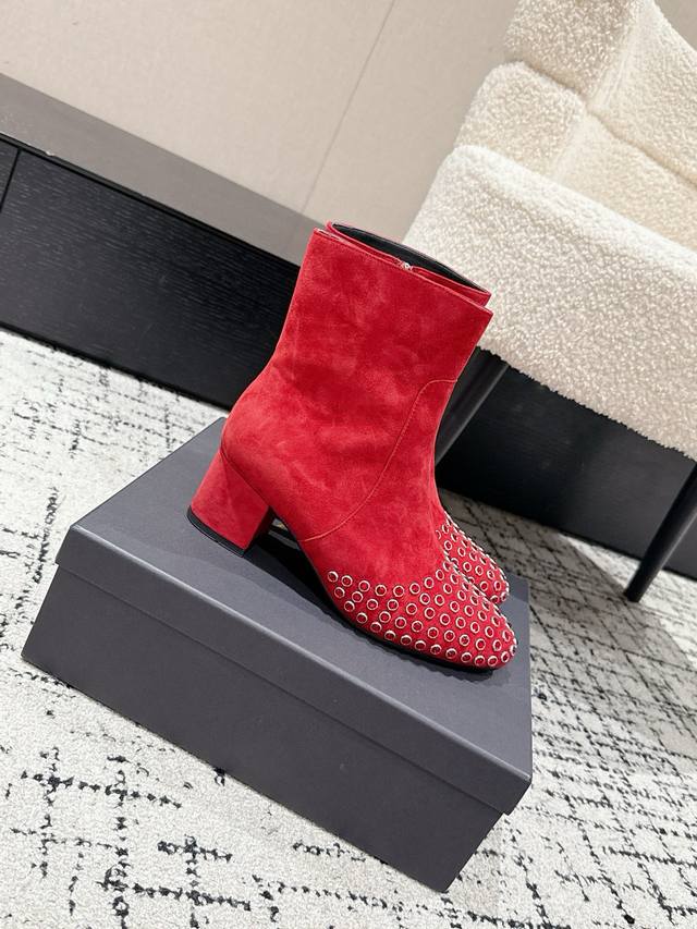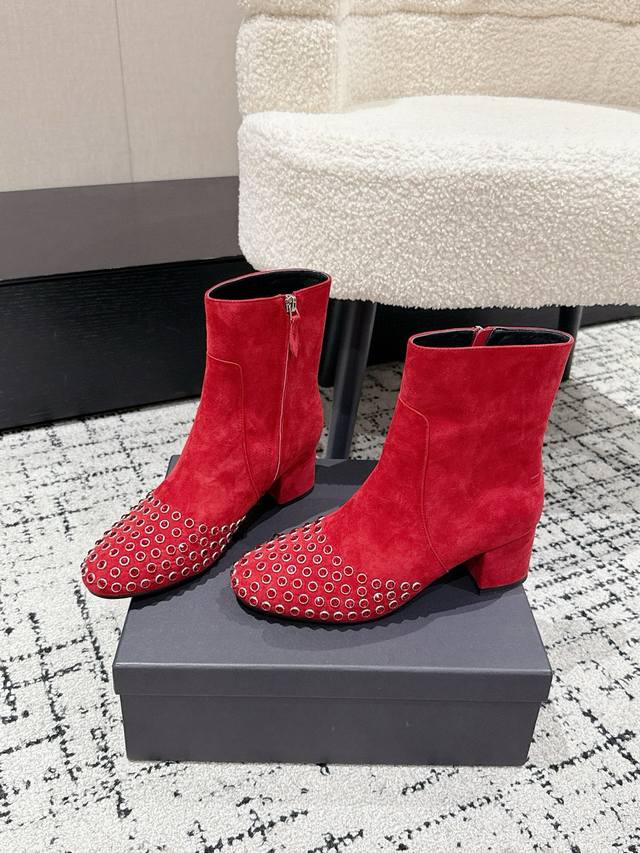 这双短靴太绝啦 麂皮质感高级 鞋头铆钉圈设计超吸睛 拉链细节利落又酷 穿上秒变街头最飒的崽 适配各种时髦穿搭 轻松拿捏潮流腔调
