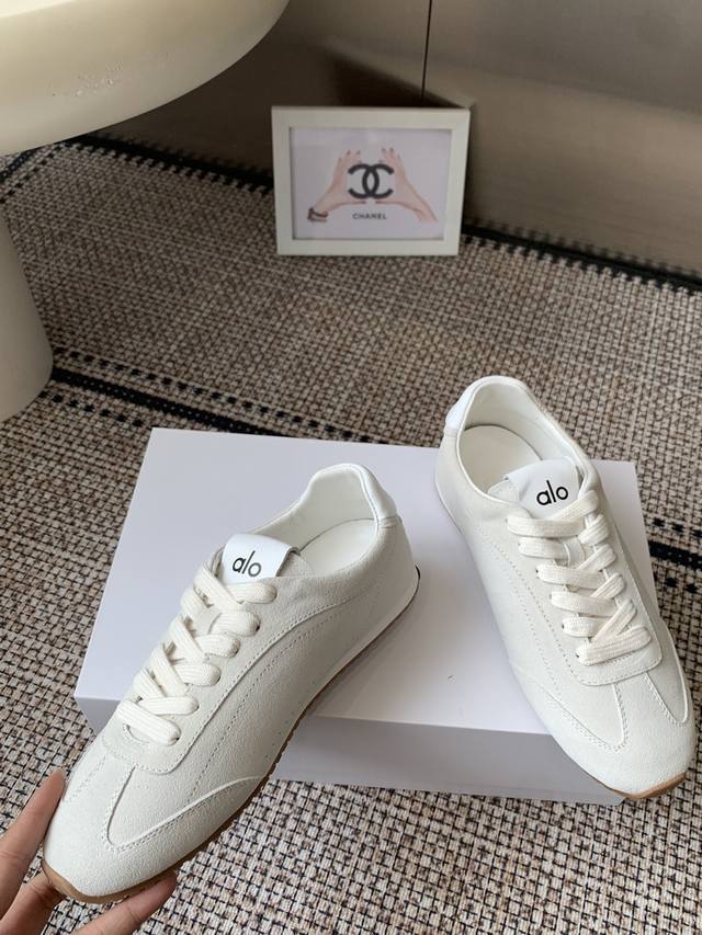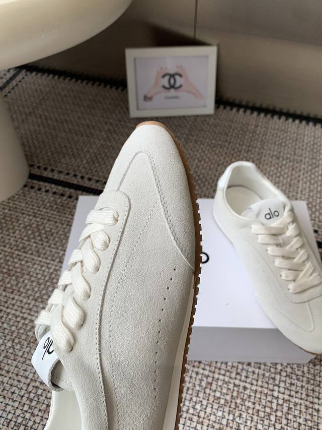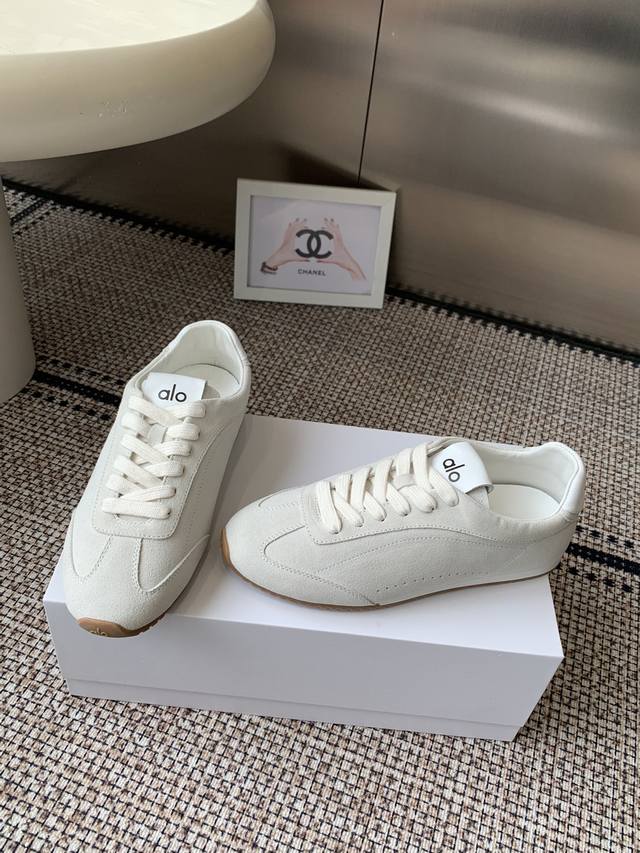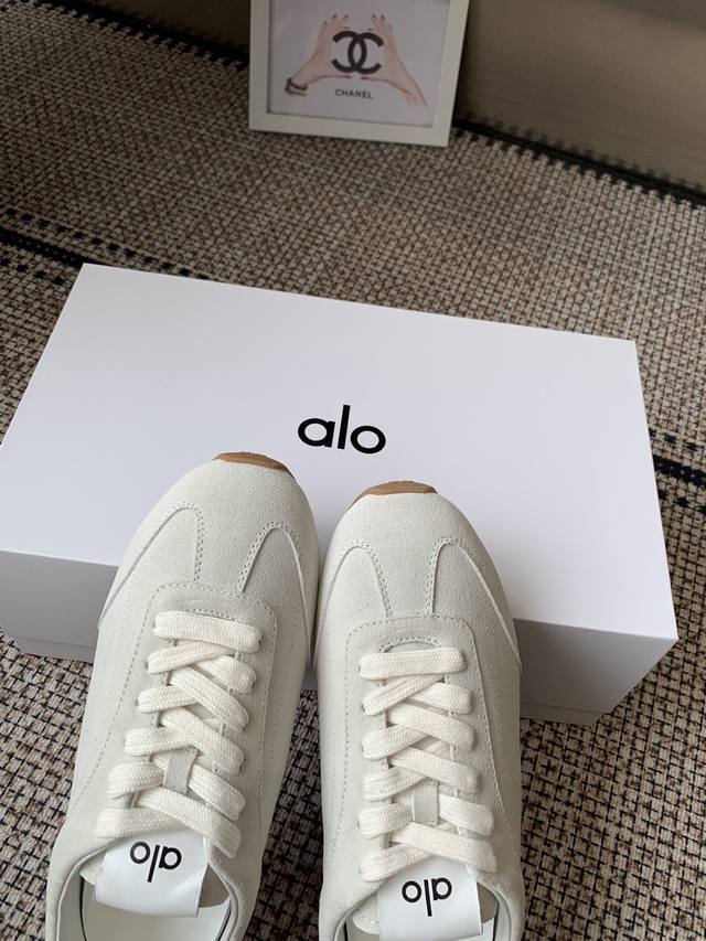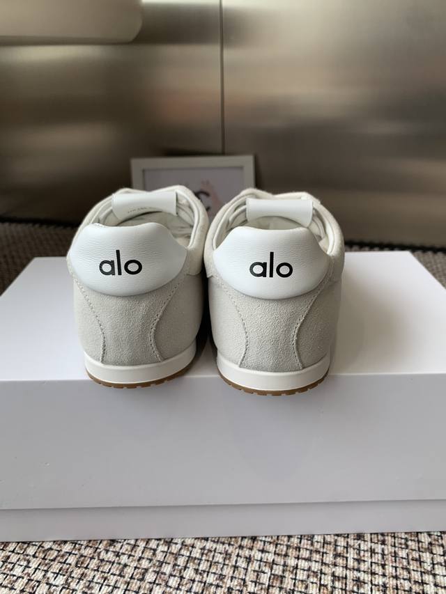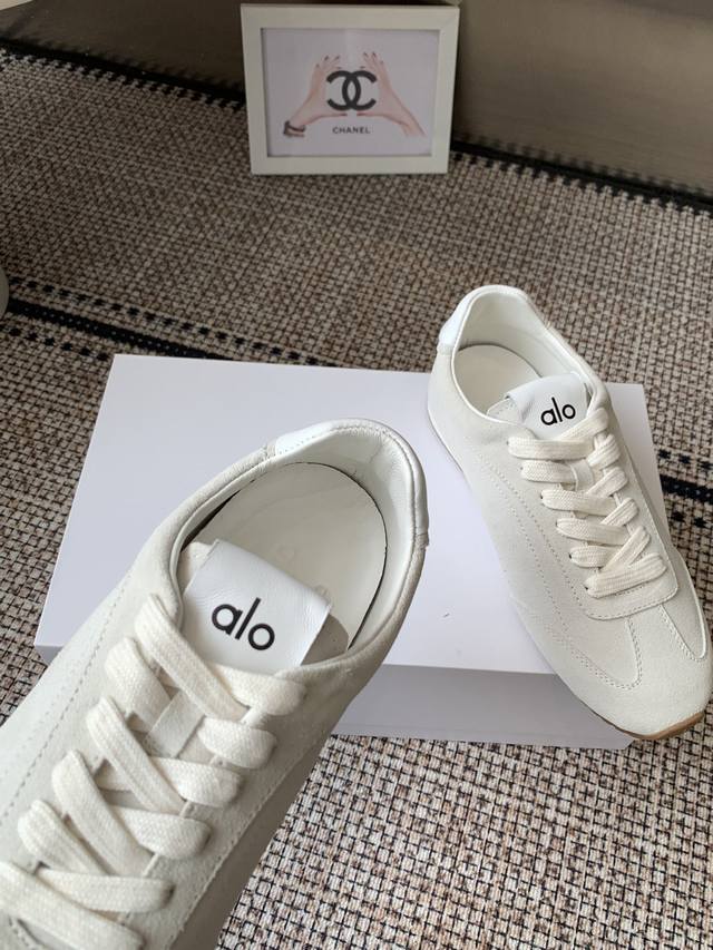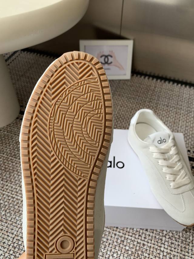 Alo 25Ss新品 休闲运动鞋 德训鞋 情侣款 上脚超级百搭 而且超级舒适 上脚一点都不沉重 非常轻便 套上袜套搭配更好看 上脚增高显腿细 面料原版牛京 内里
