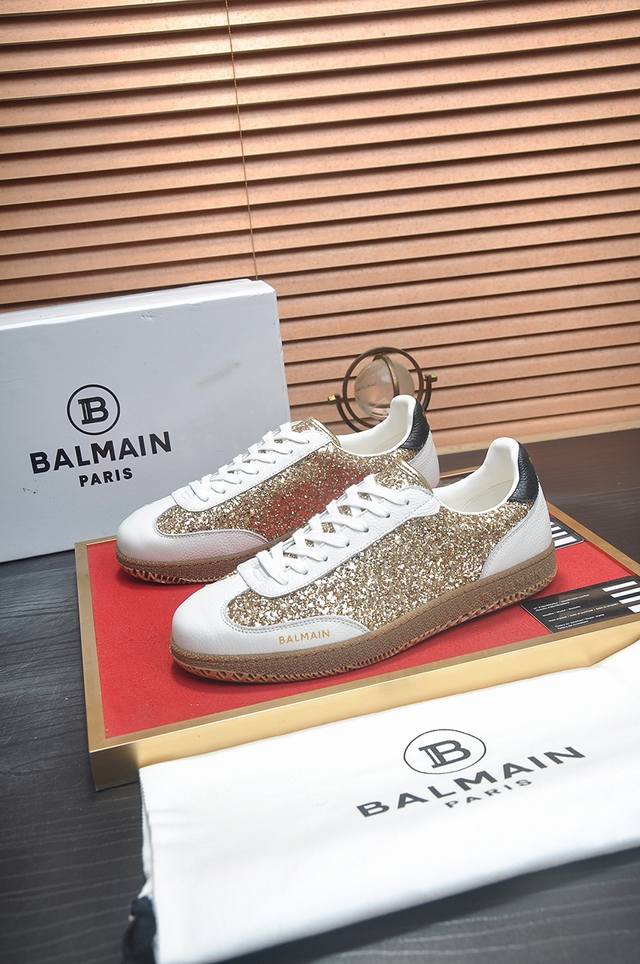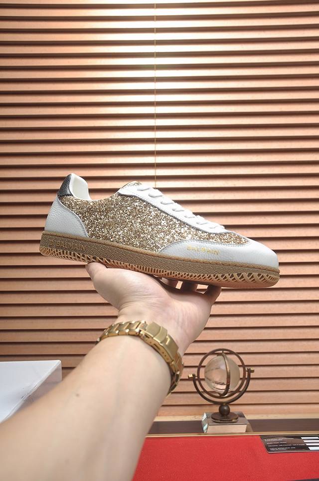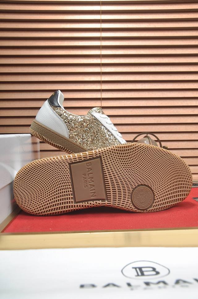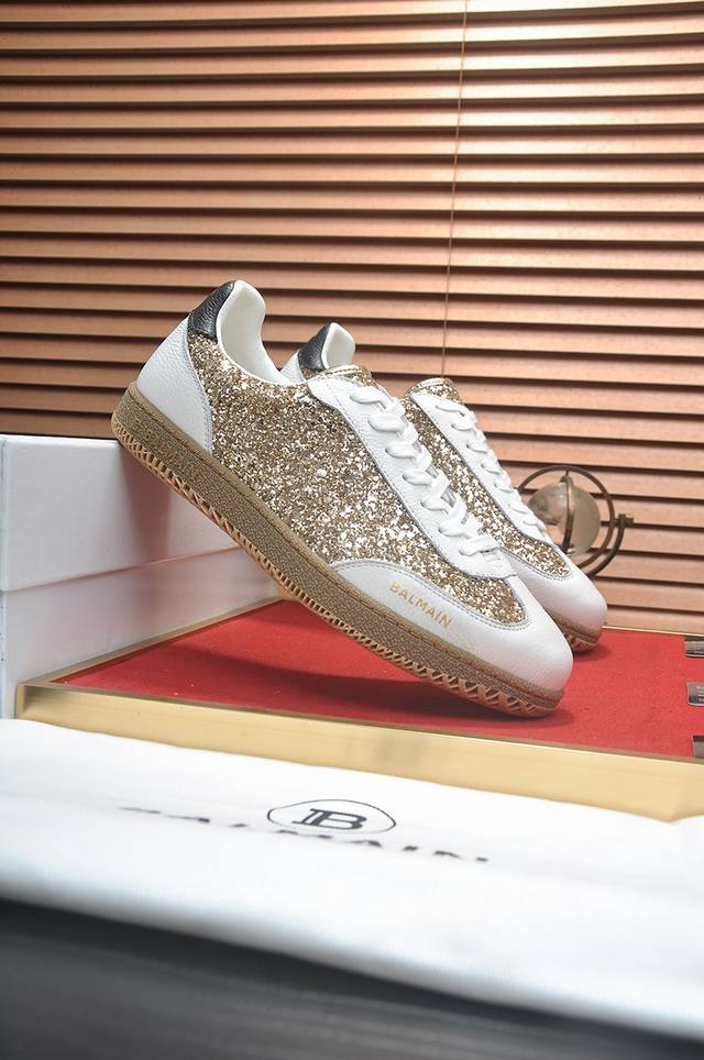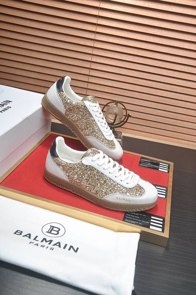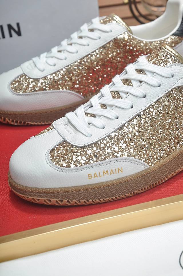 B-Skate 多材质拼接撞色运动鞋 ,鞋面饰有黑色鞋带,头层牛皮拼接鞋舌点缀 Balmain 徽标, 牛皮内里tpu 鞋底饰有同色系 Balmain 徽标。