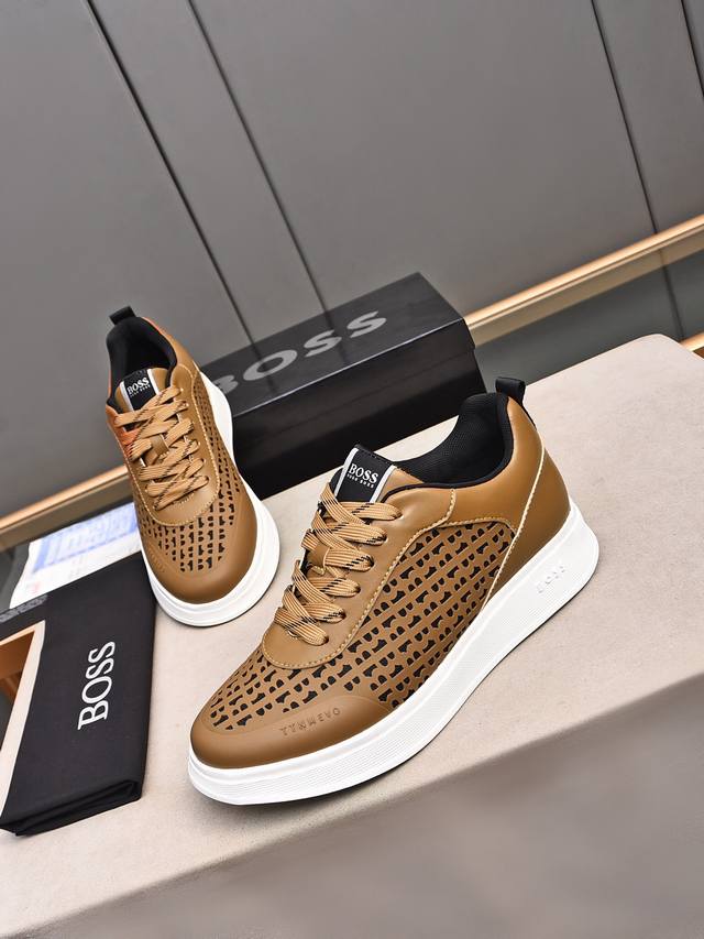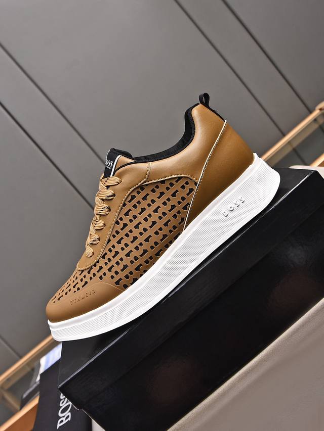 Boss做工考究,优雅含蓄设计,大方简洁,剪裁新颖,毎一个小细节都做得尽善尽美,演绎出男士细腻韵味,彰显气质内涵。鞋面进口小牛皮压花舒适透气网里。超轻耐磨发泡大底!38-44 45定做 多色选