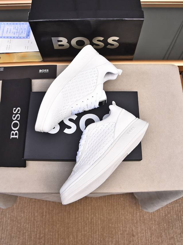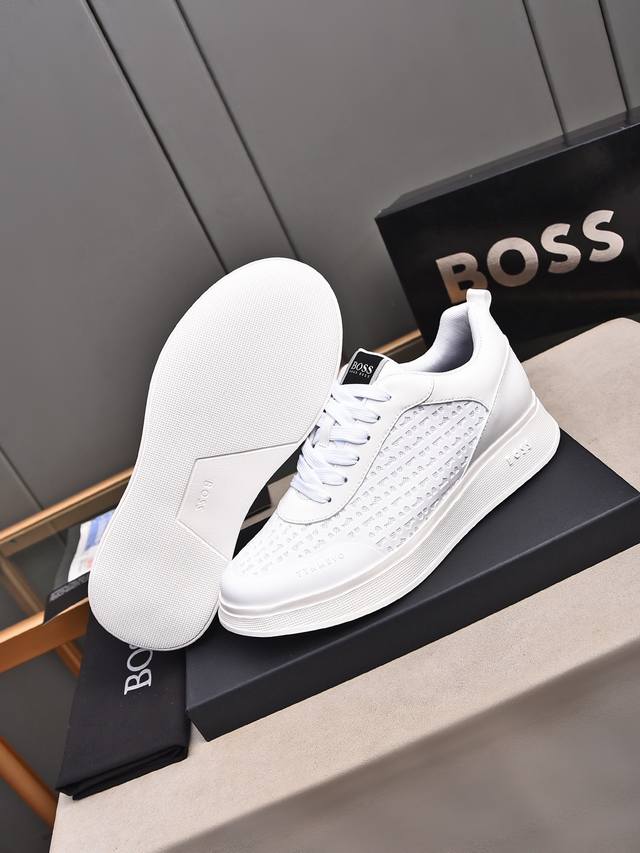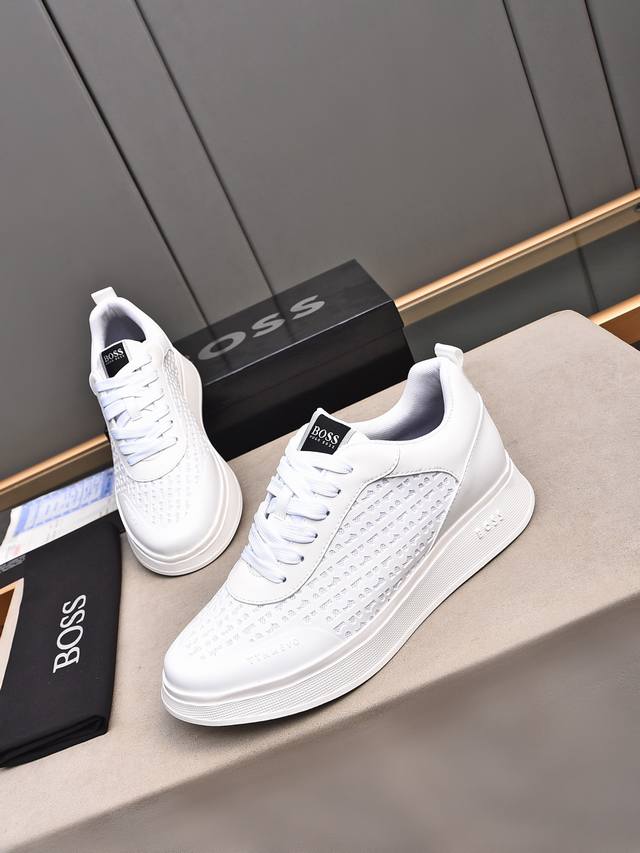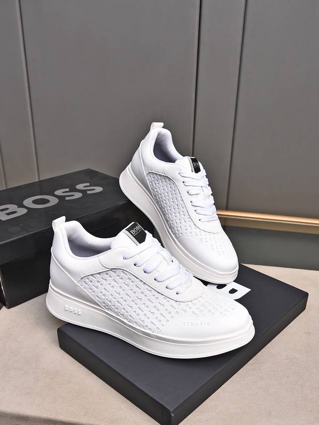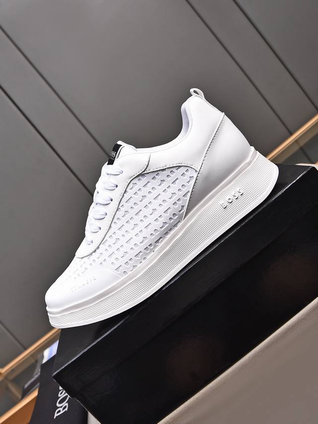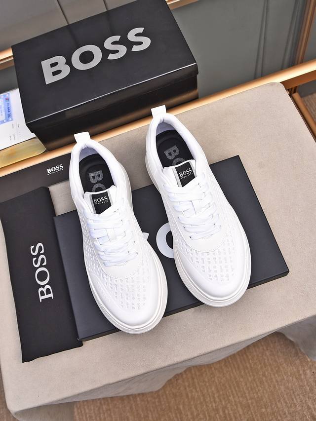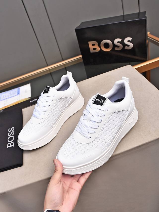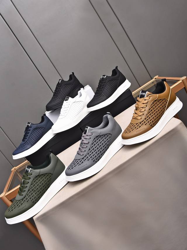 Boss做工考究,优雅含蓄设计,大方简洁,剪裁新颖,毎一个小细节都做得尽善尽美,演绎出男士细腻韵味,彰显气质内涵。鞋面进口小牛皮压花舒适透气网里。超轻耐磨发泡大底!38-44 45定做 多色选