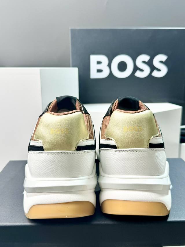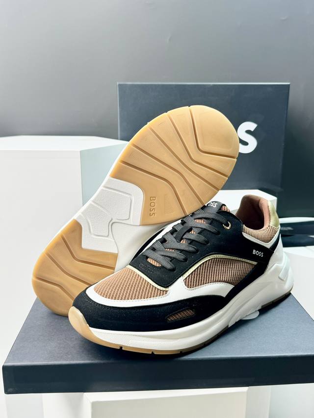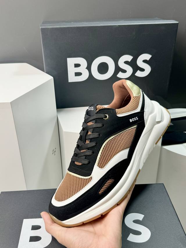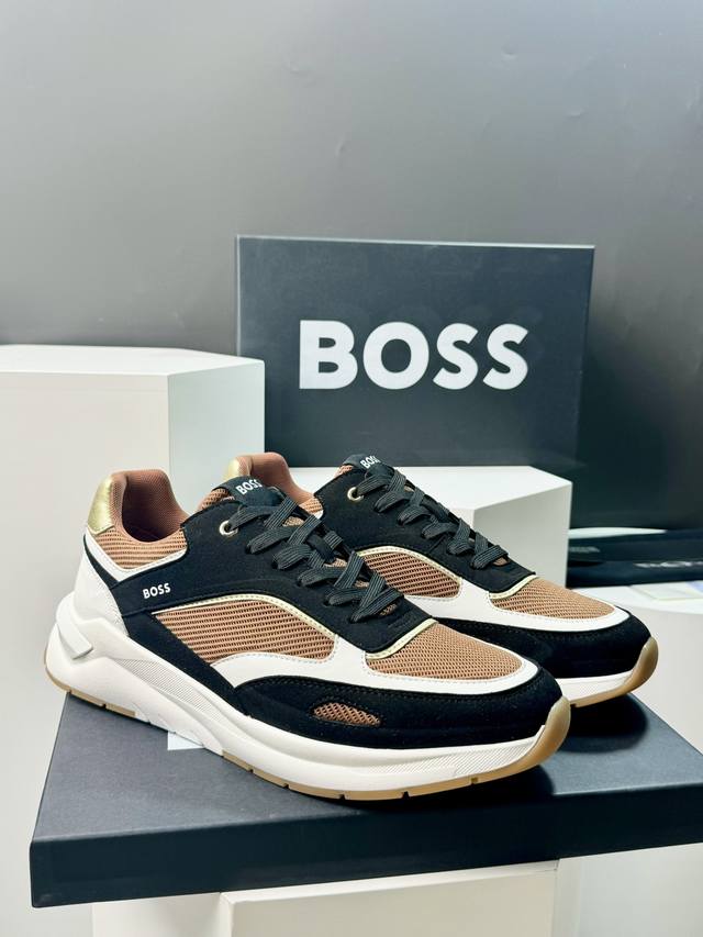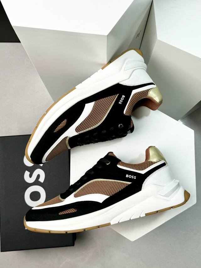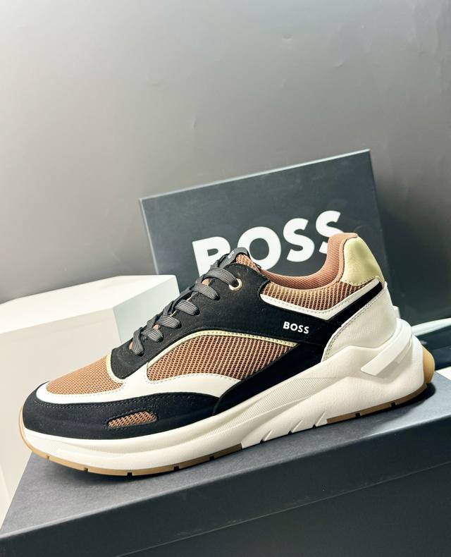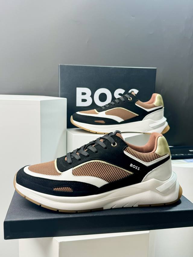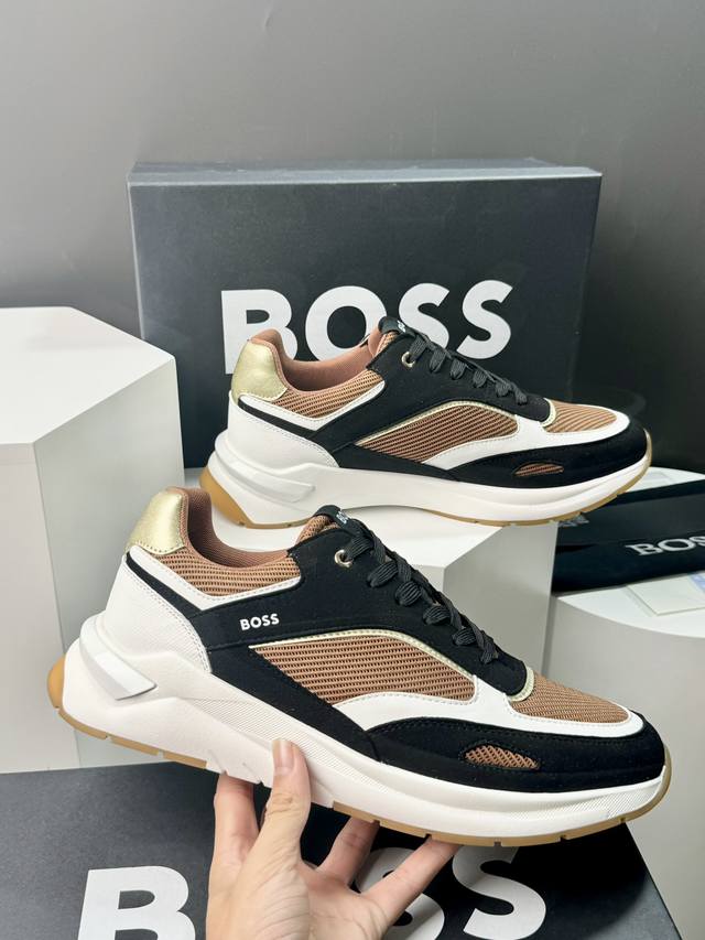 Boss 时尚顶级潮牌,一款能驾驭各种风格男鞋,鞋面由多种材质拼接而成,内里为进口网布,吸汗舒适,发泡超轻大底设计是重中之重-轻便.舒适。极度考验工艺要求:双色