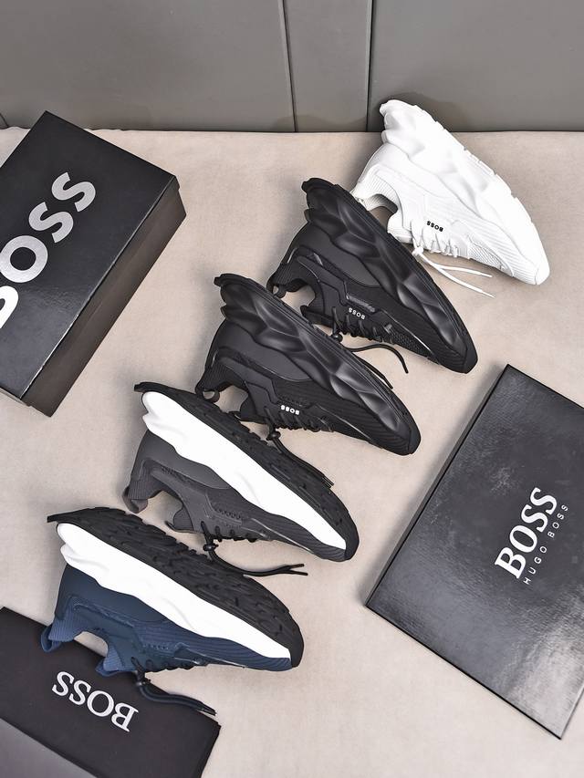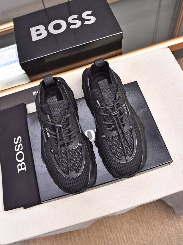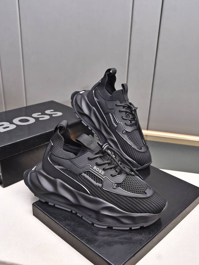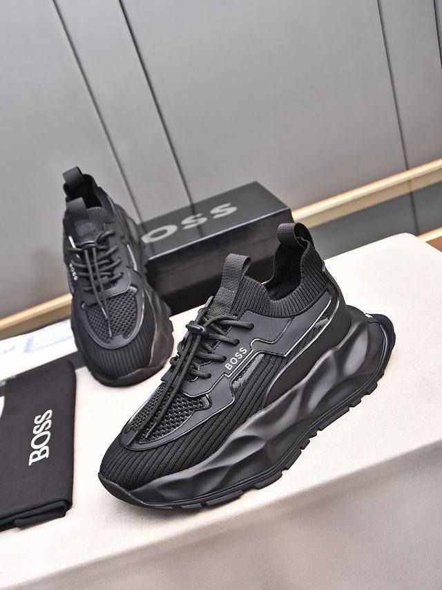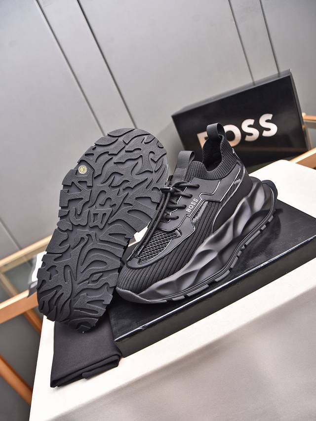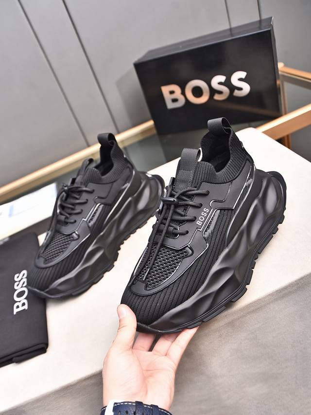Boss 高端劲爆款 专柜1设计 面部采用高弹力飞织+牛皮+进口滴胶!Tpu大底,上脚方便,轻盈舒适有弹力,新潮时尚!!!多色选!码数:38-44 45 46定做