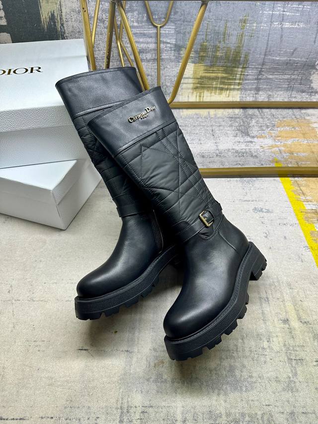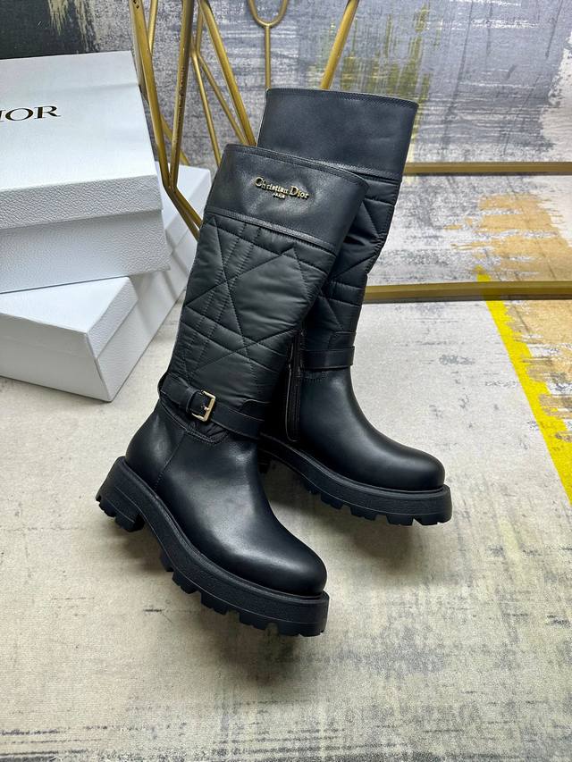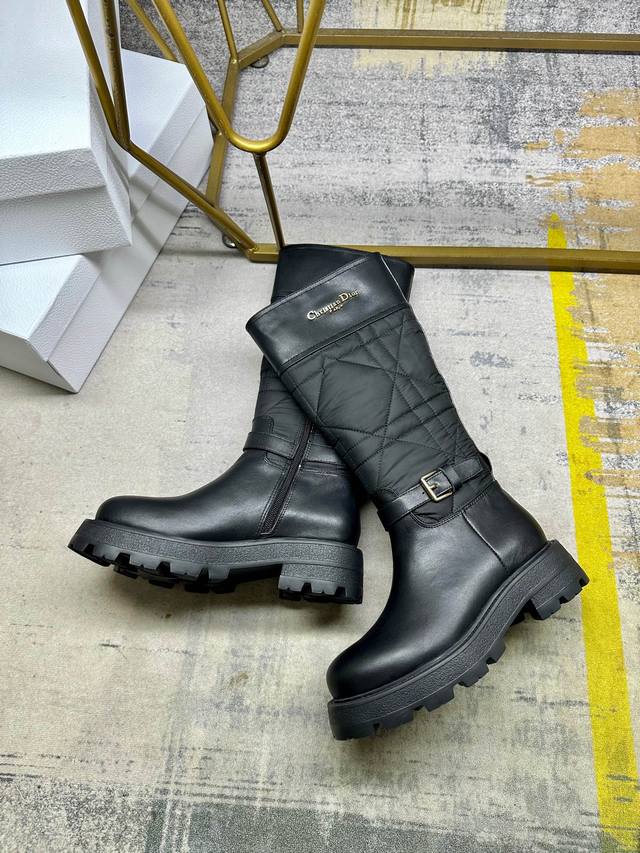 d-Town靴子,黑色牛皮和尼龙组合鞋面,尼龙饰以藤格纹辑面线,侧面装饰性饰带点缀以金色饰面金属Logo标志和搭配搭扣可调节系带提升格调,突显脚踝线条。羊皮内里