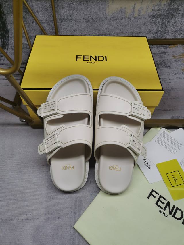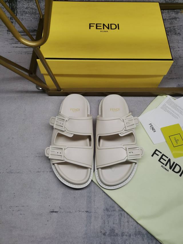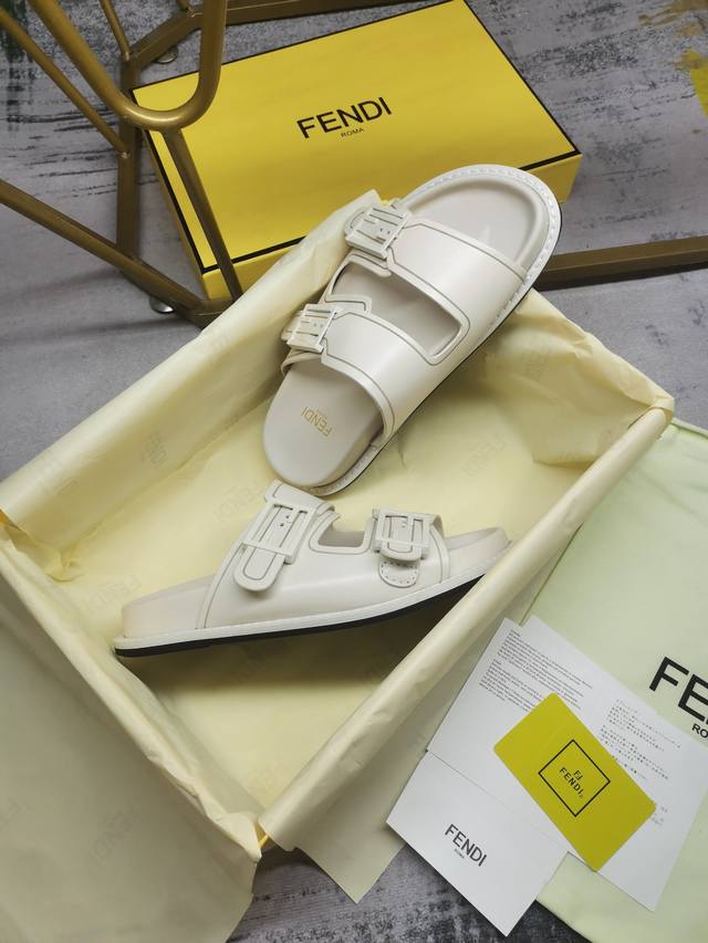 fendi最新爆款双带平底拖鞋,带ff装饰性搭扣,奶油白色牛皮+边缘饰有雕刻,35-45码