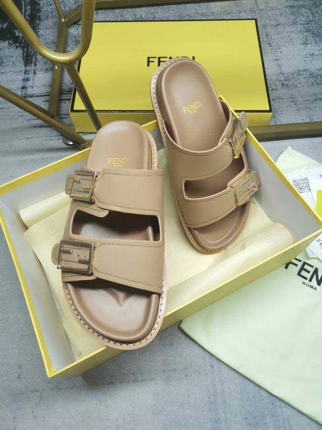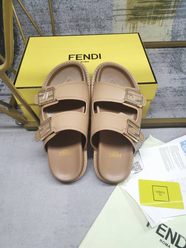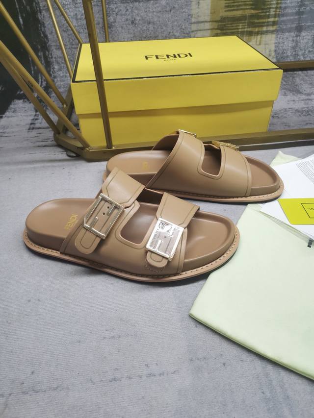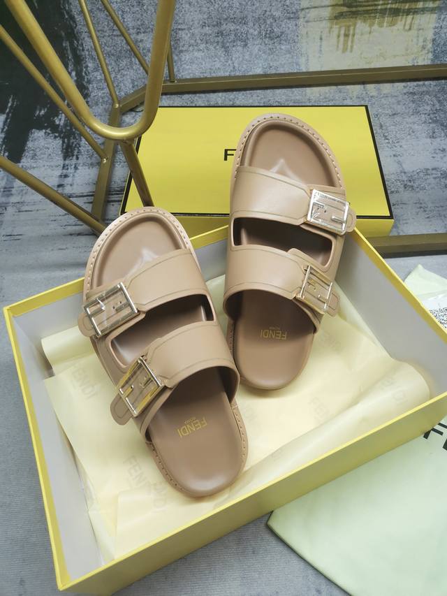 fendi最新爆款双带平底拖鞋,带ff装饰性搭扣,深杏色牛皮+边缘饰有雕刻,35-45码