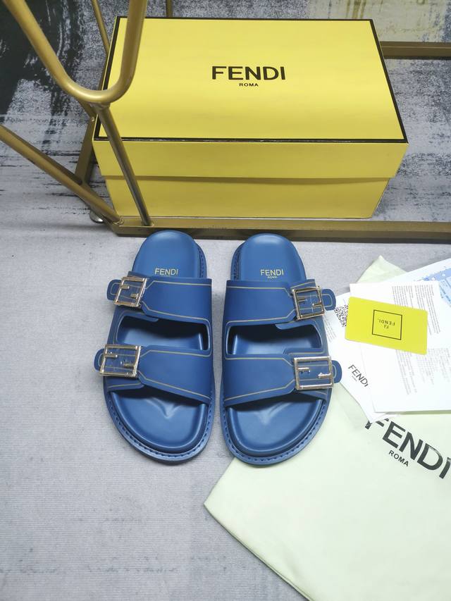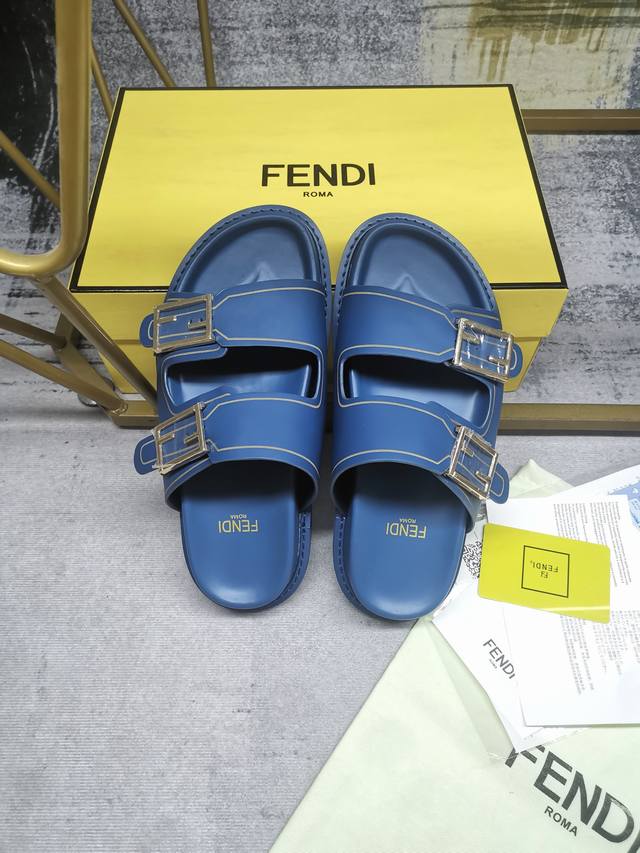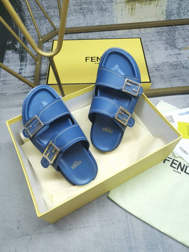 fendi最新爆款双带平底拖鞋,带ff装饰性搭扣,蓝色牛皮+边缘饰有雕刻,35-45码