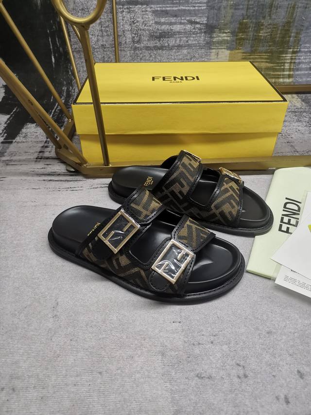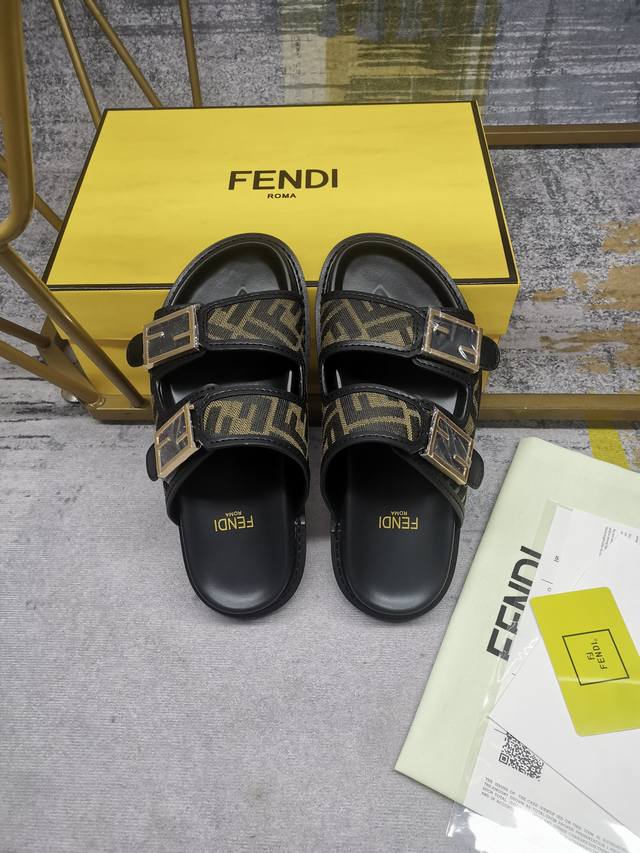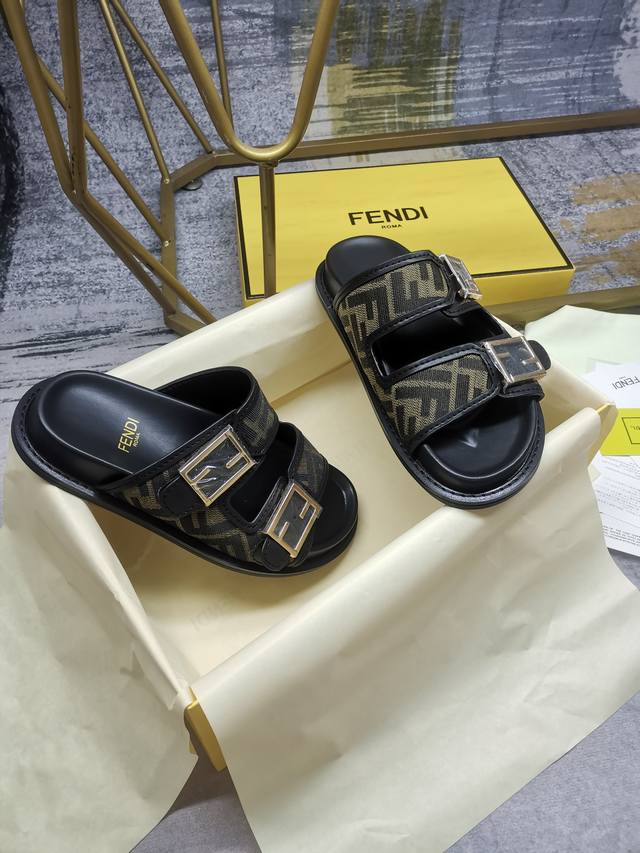 fendi最新爆款双带平底拖鞋,带ff装饰性搭扣,饰有ff图案提花布料+同色皮边缘,35-45码