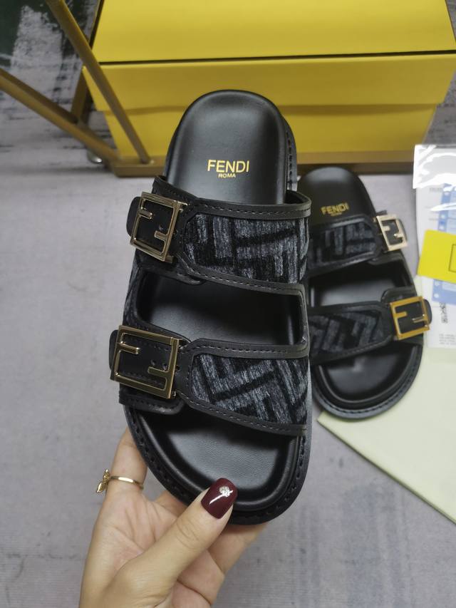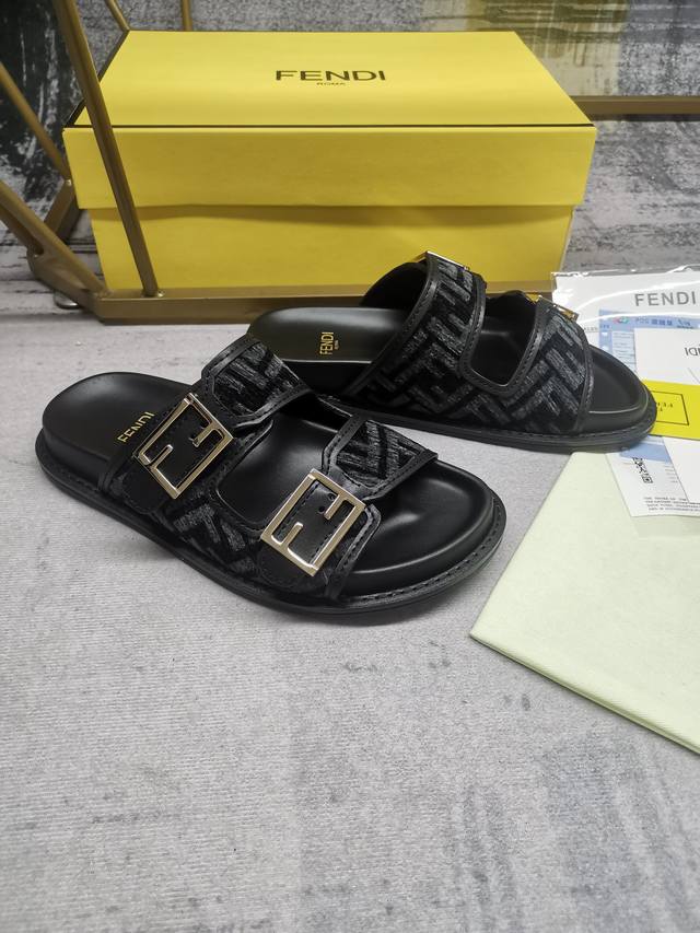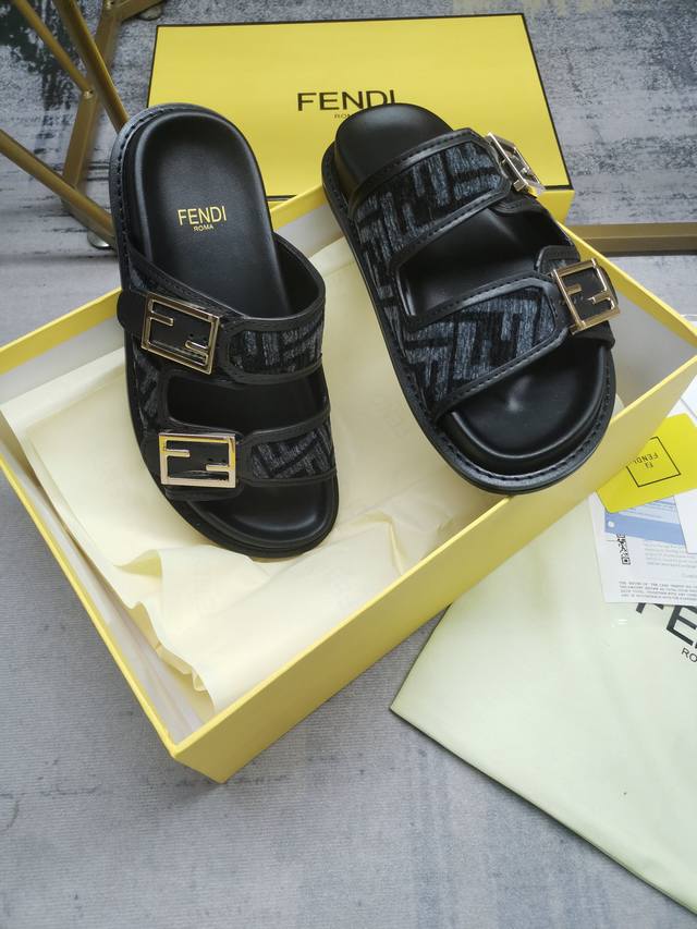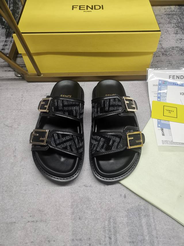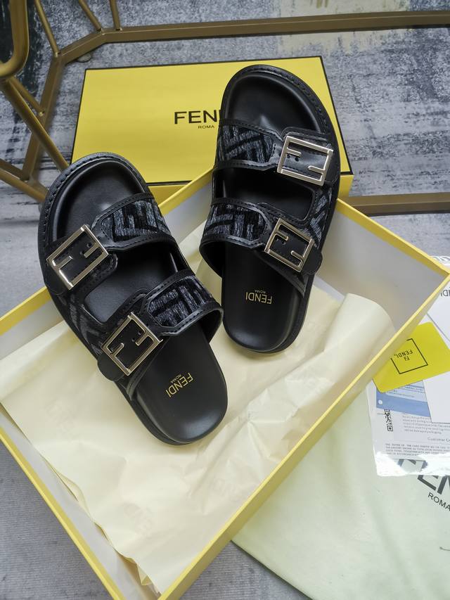 fendi最新爆款双带平底拖鞋,带ff装饰性搭扣,饰有ff图案提花布料+浅棕色皮边缘,35-45码