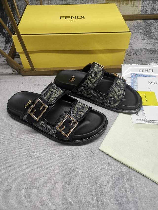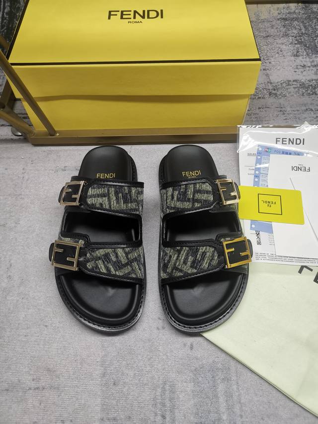 fendi最新爆款双带平底拖鞋,带ff装饰性搭扣,饰有ff图案提花布料+浅棕色皮边缘,35-45码