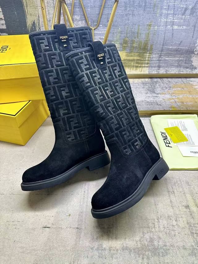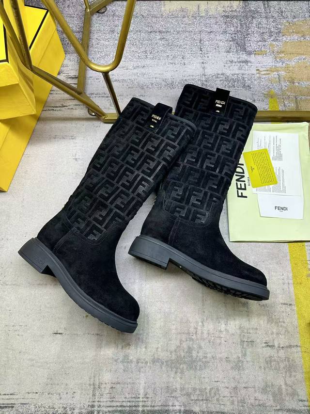 fendi最新爆款骑士高筒靴,黑色绒面材质,鞋腿饰有标志性烫印Ff图案,搭配金属扣件字样细节,羊皮内里垫脚,同色系大底,35-42码,