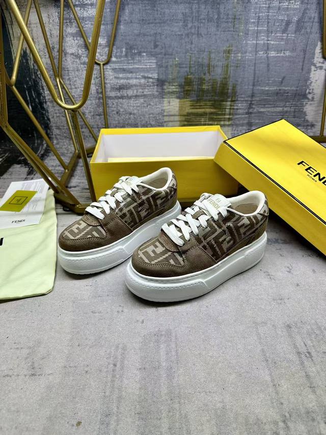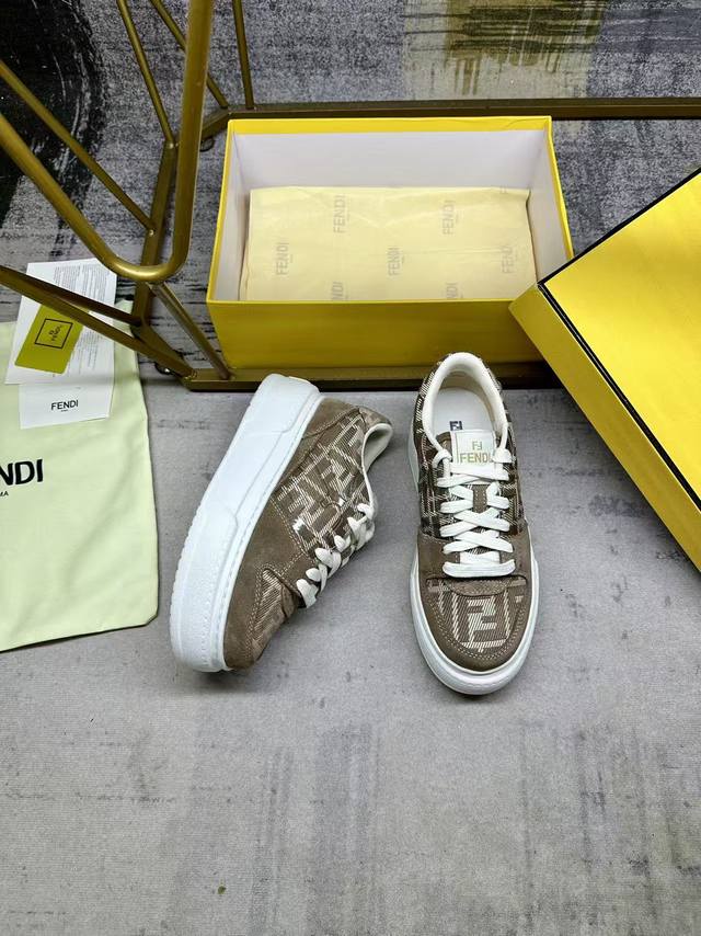 fendi Match系带最新运动鞋,卡其色Ff提花面料和同色绒面材质细节,侧面饰以注塑Ff贴花。女码35-40码 ,男码39-45码