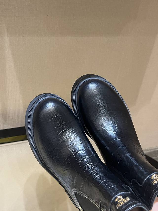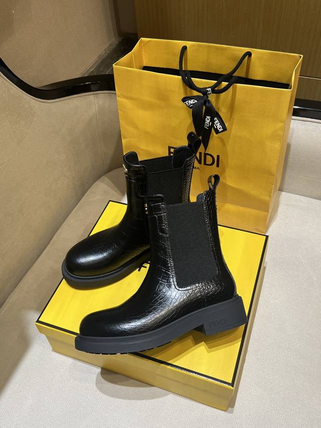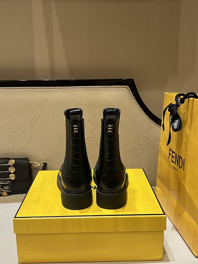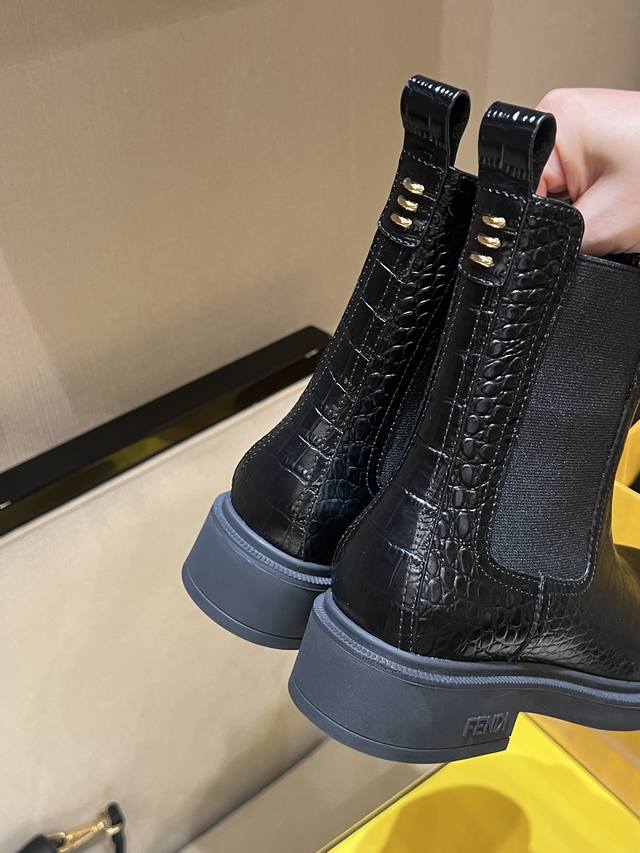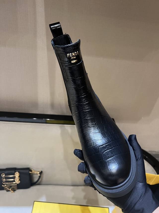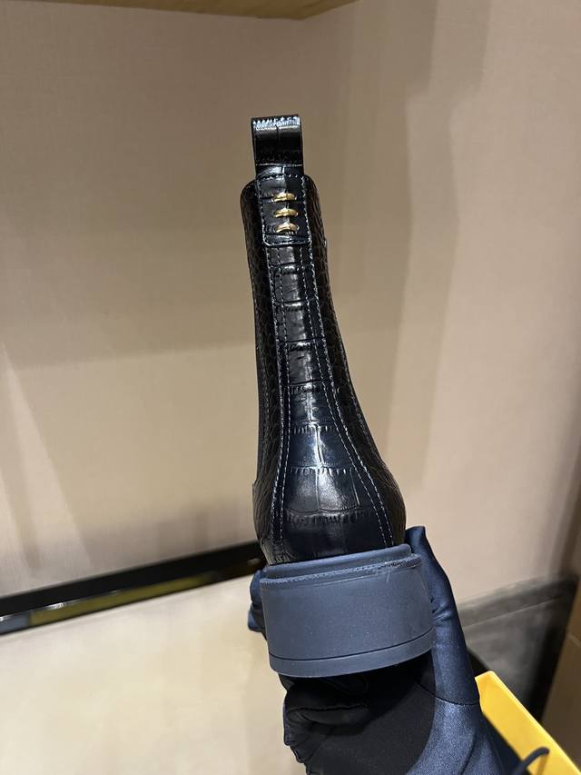 fen*Filo机车靴,圆头,侧面有松紧嵌饰。鞋面、靴筒全部采用优质原版鳄鱼纹小牛皮,正面饰金属凸纹压花ff Roma压花,顶级水染牛皮内里!