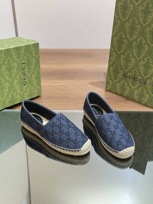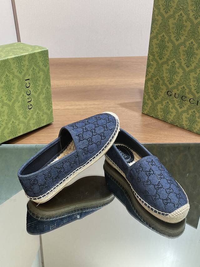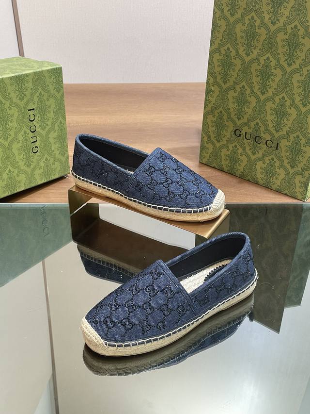 G家新款丹宁牛仔Gg水晶草编麻绳底渔夫鞋,高版本!最新牛仔水钻系列单鞋