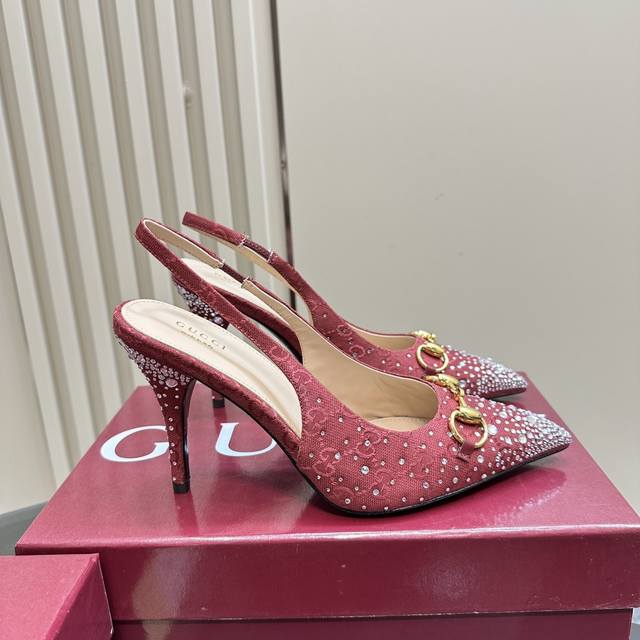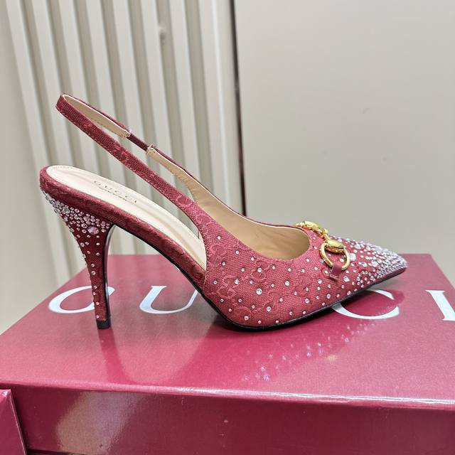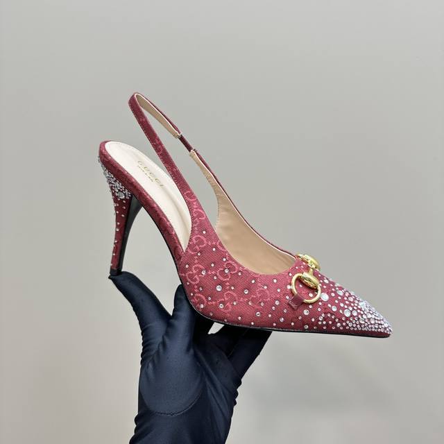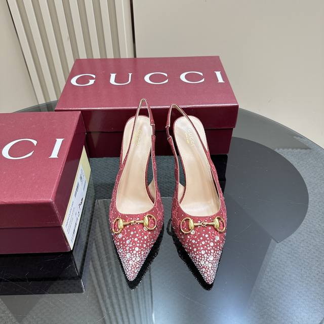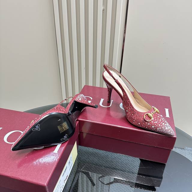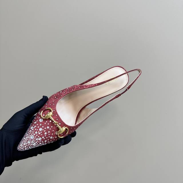 G家新款gucc马衔扣浅口凉鞋尖头,松紧绑带和猫跟相辅相成,造就舒服贴合的版型设计,后系带浅口鞋倾注设计精髓。烫钻工艺