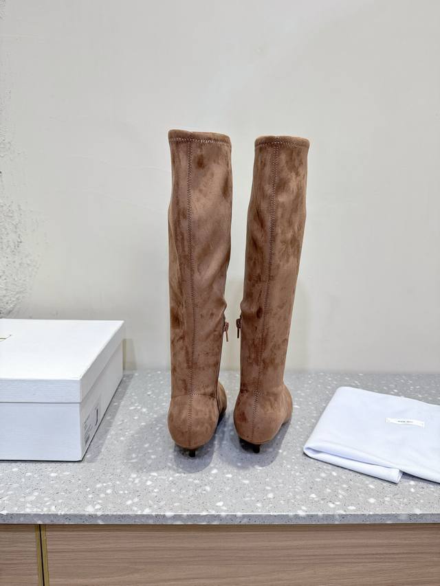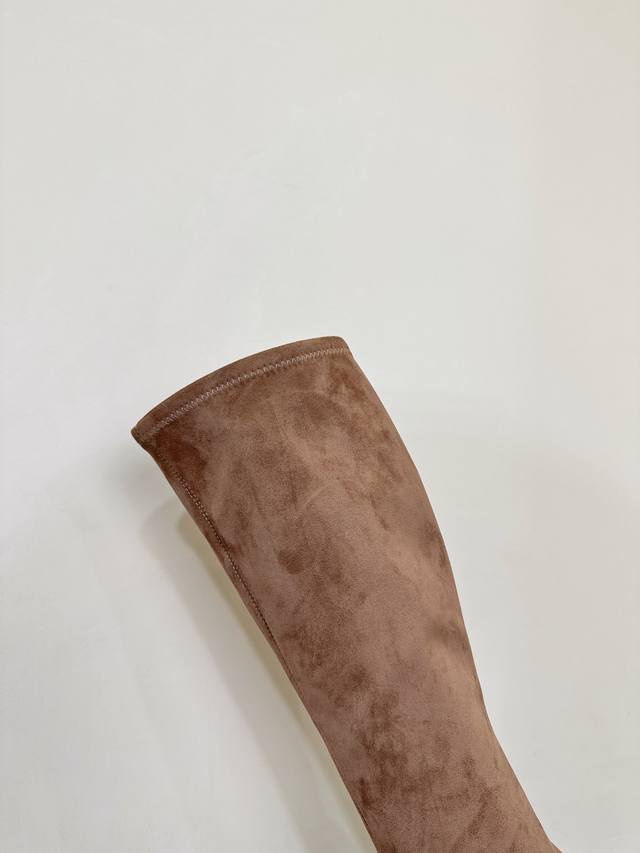 弹力绒面材质,这种材质不仅贴合腿部线条,能很好地修饰腿型,让腿部看起来更修长流畅,而且绒面材质自带一种高级的哑光质感,增添了靴子的奢华感与复古氛围。