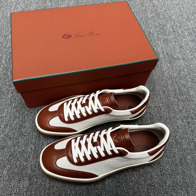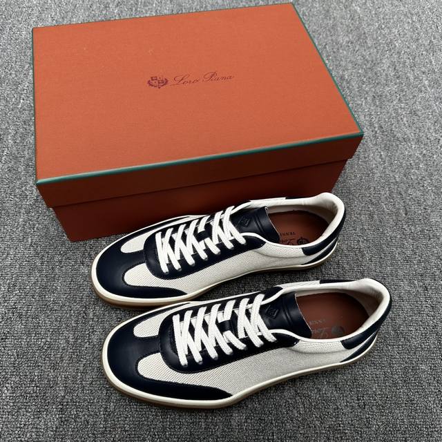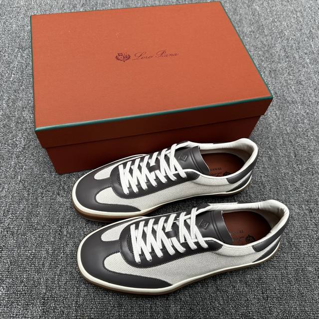 Loro piana 诺悠翩雅 这款新款灰织面革网球鞋采用超低帮设计,适合全年穿着,并具有防水性能。包边鞋底营造轻松迷人的色彩组合,将功能性与低调个性风格和谐融合。打造都市着装的理想鞋履选择。鞋跟处饰以Kummel色嵌片柔软小牛皮鞋舌,压印Lp徽标棉质鞋带