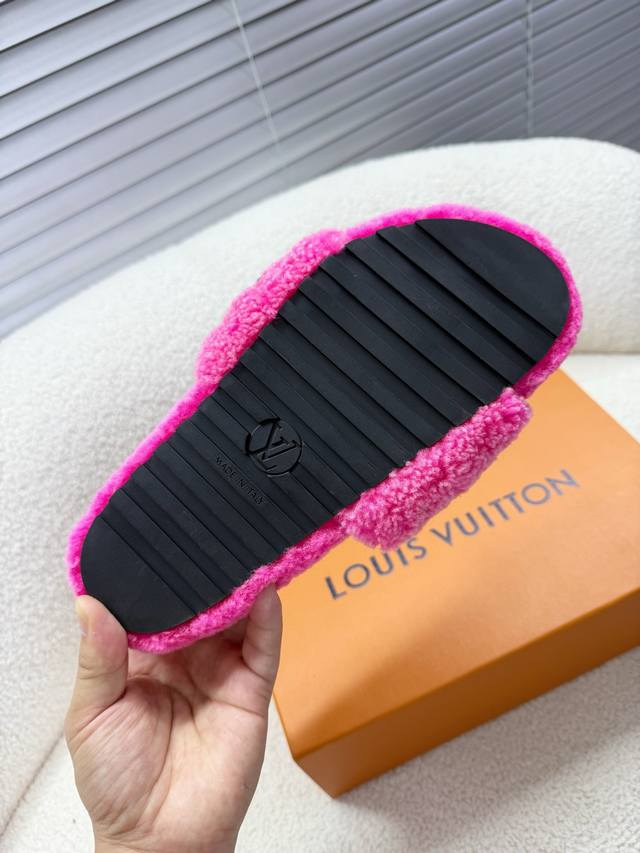 lv 毛拖,超级舒适的一款羊羔毛拖鞋 %纯羊羔毛被植入品牌元素后,百搭、时尚、潮款、懒人至爱,被完美释放 面料 内里 垫脚包底全都是羊羔毛 拼接色Logo呈现奢