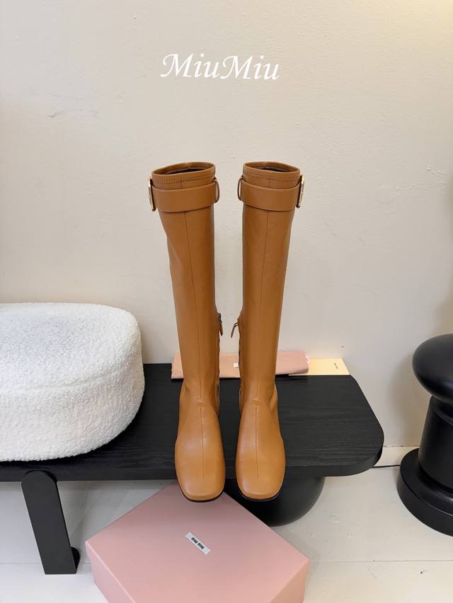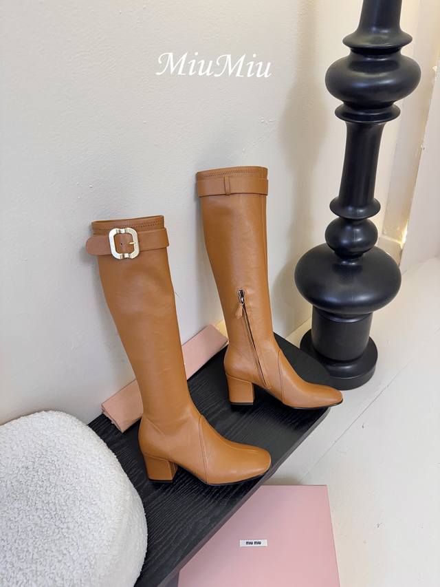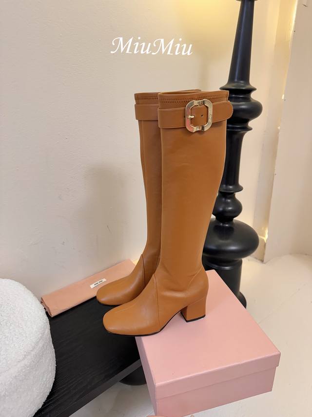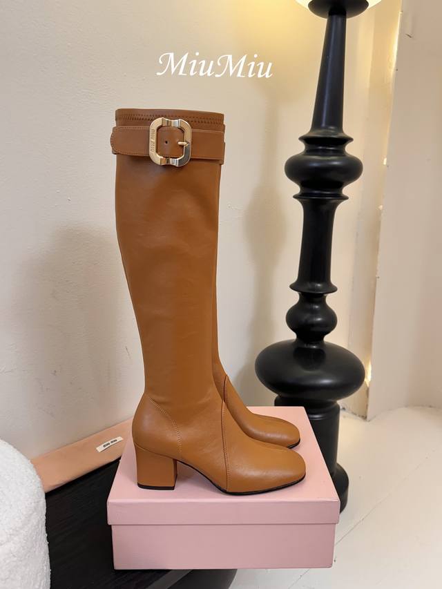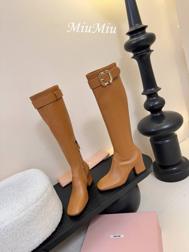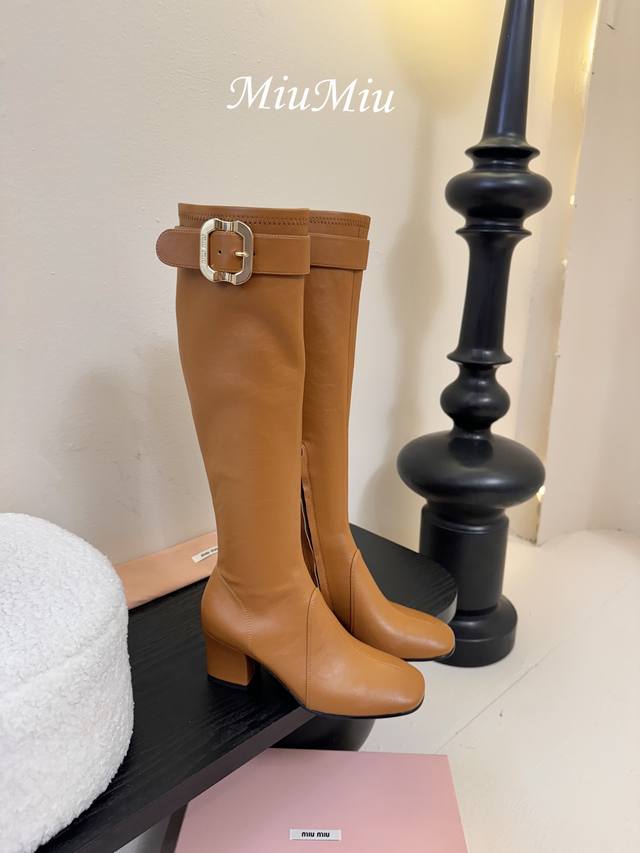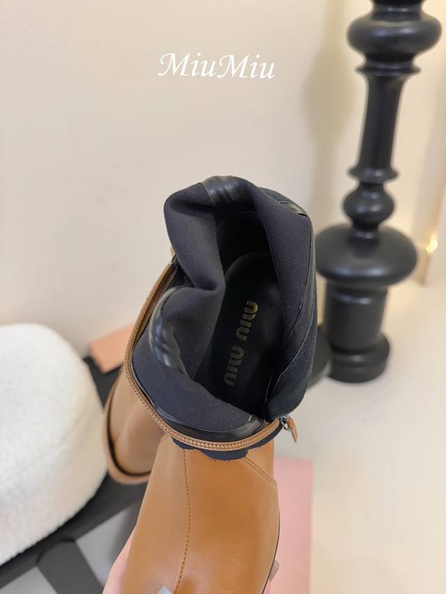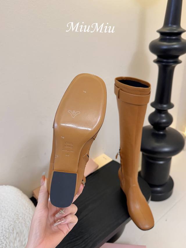 Miu家每个季节这款靴子都有新的演变。在本季,对其功能性有了更具女性气质的诠释,线条流畅,轻柔地包裹在膝盖下方。靴子轻盈如长筒袜,像无衬里的皮革手套,性感地贴合腿部线条。