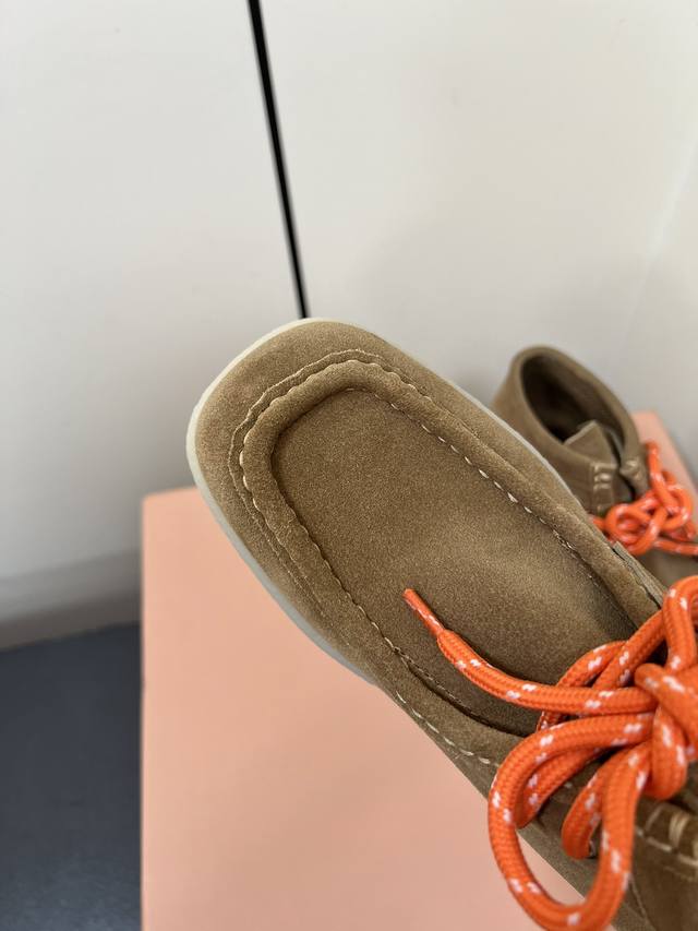 350 Miumiu缪缪小白鞋脏脏鞋饼干底2025春夏新款英伦风系带乐福鞋Miumiu秀场适当独一无二的擦色工艺工艺来自Miu Miu系列的细节特写...