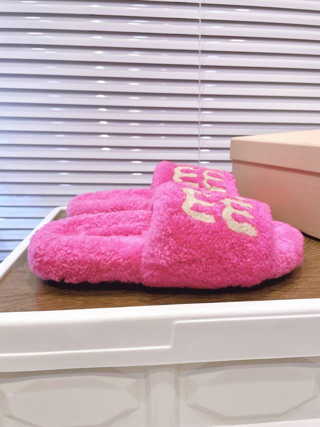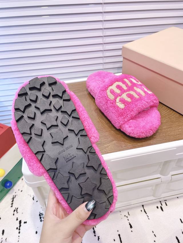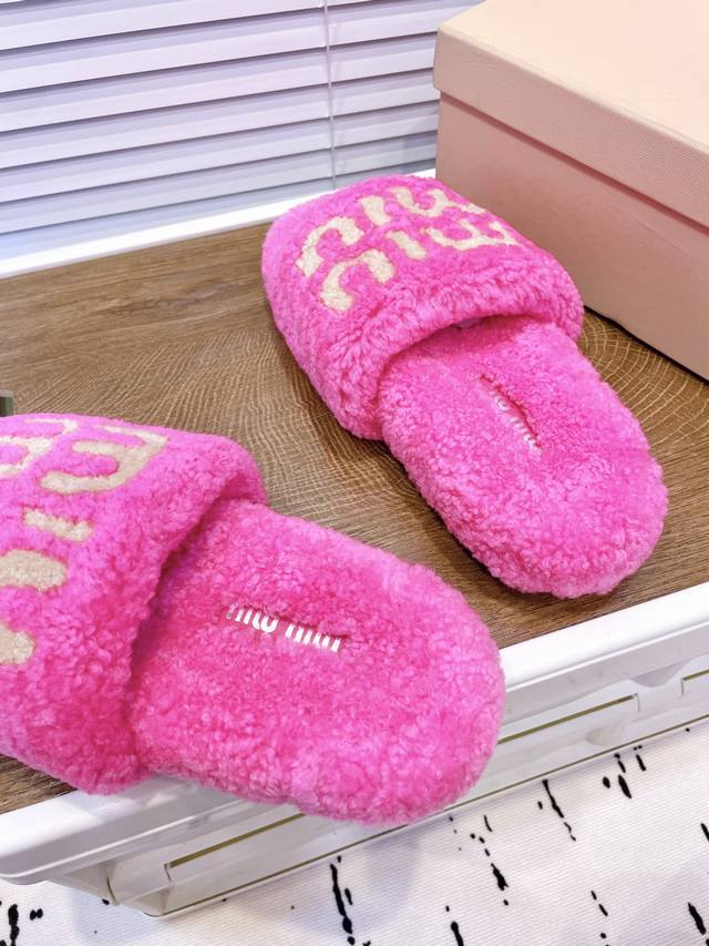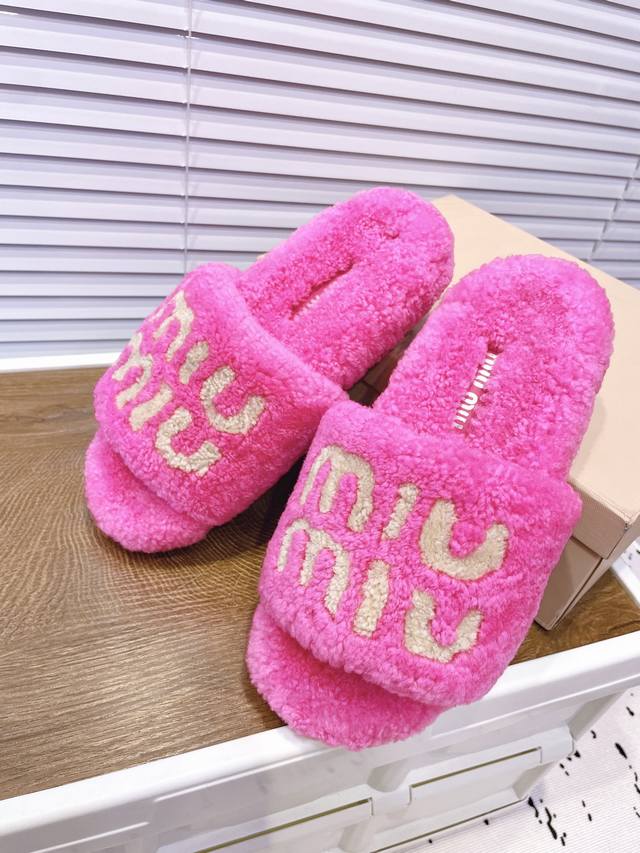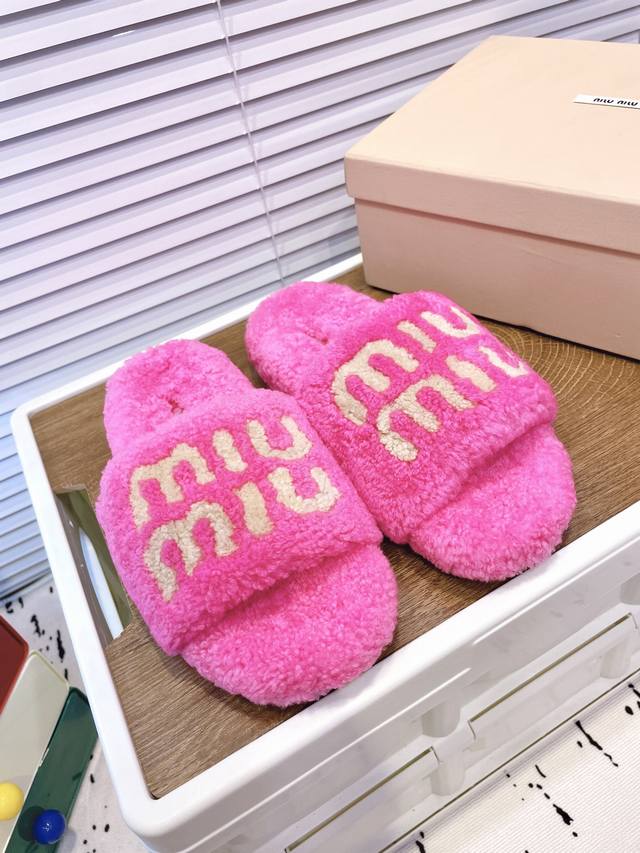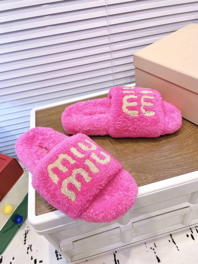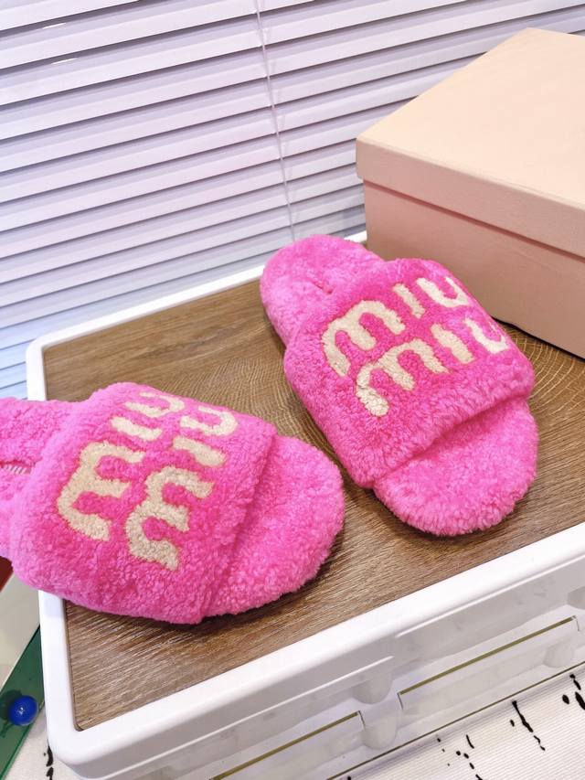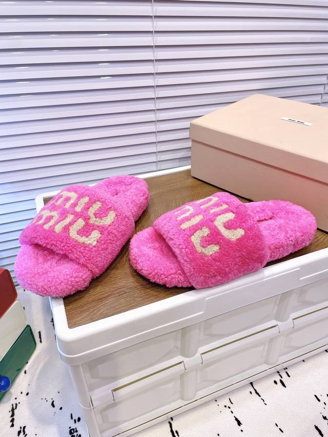 Miumiu|秋冬新品毛毛拖 居家还是外穿都是百搭时髦单品,秋冬搭配袜子,太好看了吧 鞋面进口澳洲真羊毛内里垫脚羊毛,原版防滑橡胶大底! Size:35-39