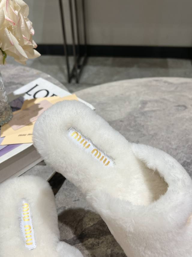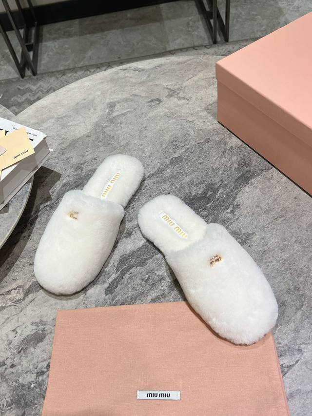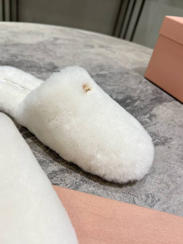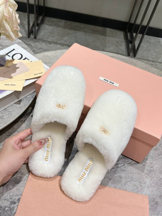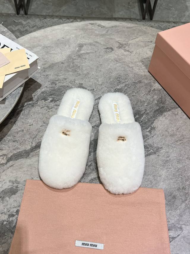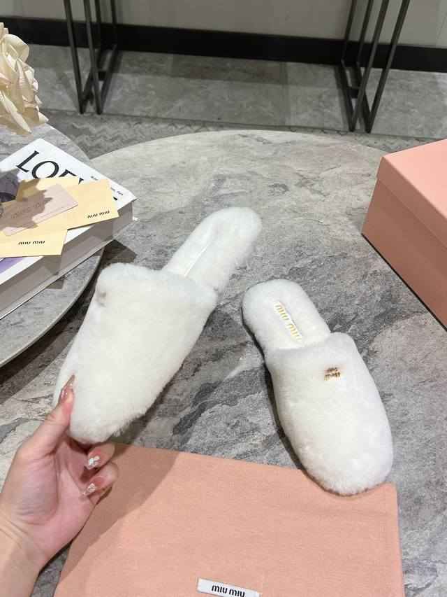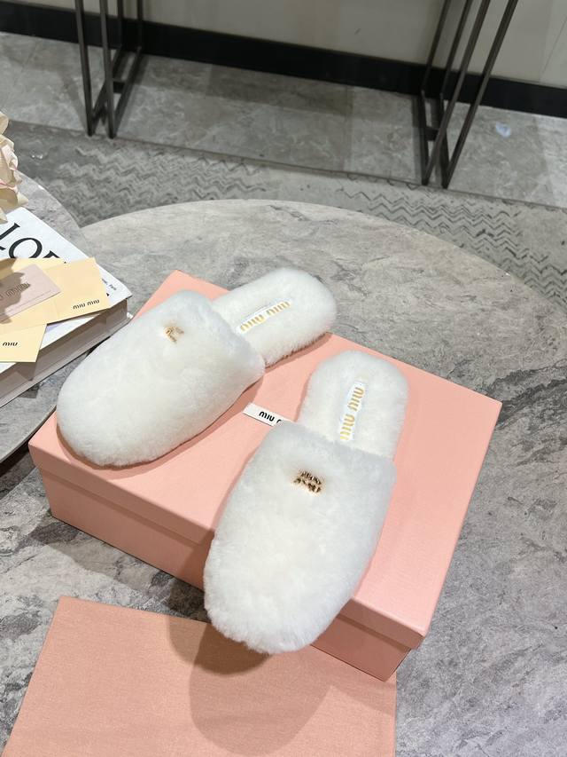 Miumiu#缪缪24秋冬款皮毛一体羊毛拖鞋# 保暖时尚舒适百搭 鞋面羊毛 内里羊皮 原版橡胶大底 Size:35-39 40.41定做 配原版一致包装