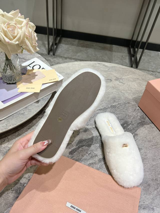 Miumiu#缪缪24秋冬款皮毛一体羊毛拖鞋# 保暖时尚舒适百搭 鞋面羊毛 内里羊皮 原版橡胶大底