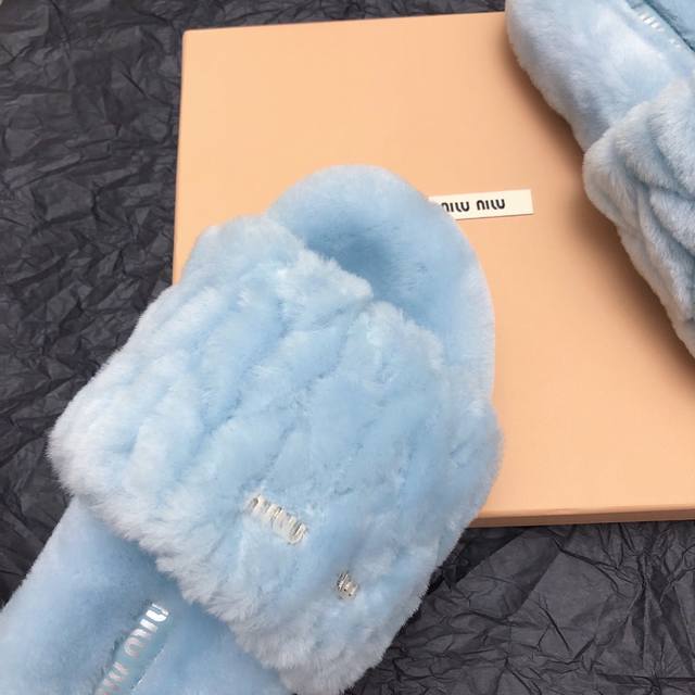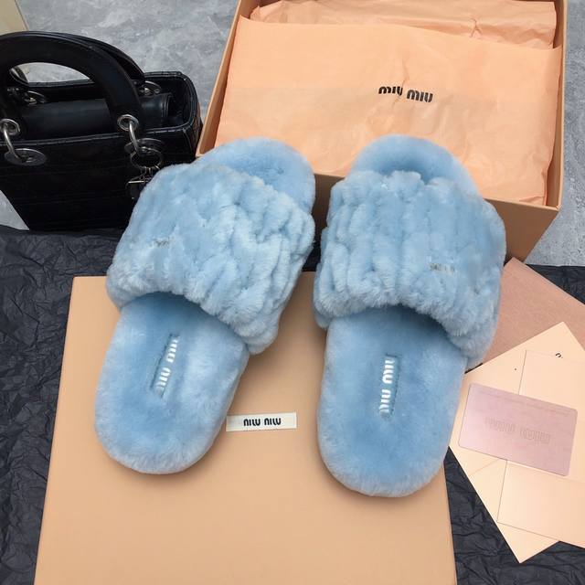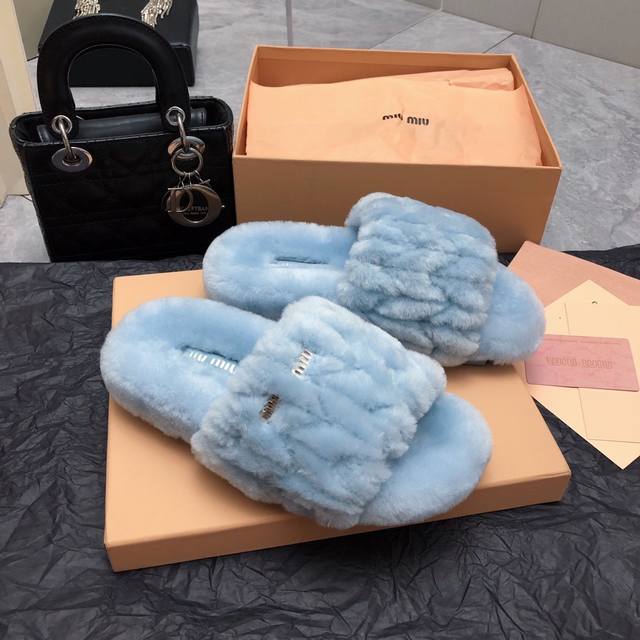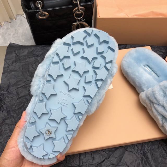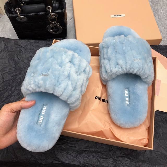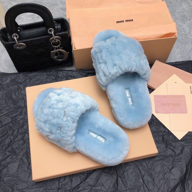 Miumiu24秋冬新品毛拖 !进口蓬松柔软组合羊毛 独特慵懒个性风格! 原版开发 全套包装 鞋面:进口羊毛 内里:羊皮 大底:成型防滑大底 码数:35-41