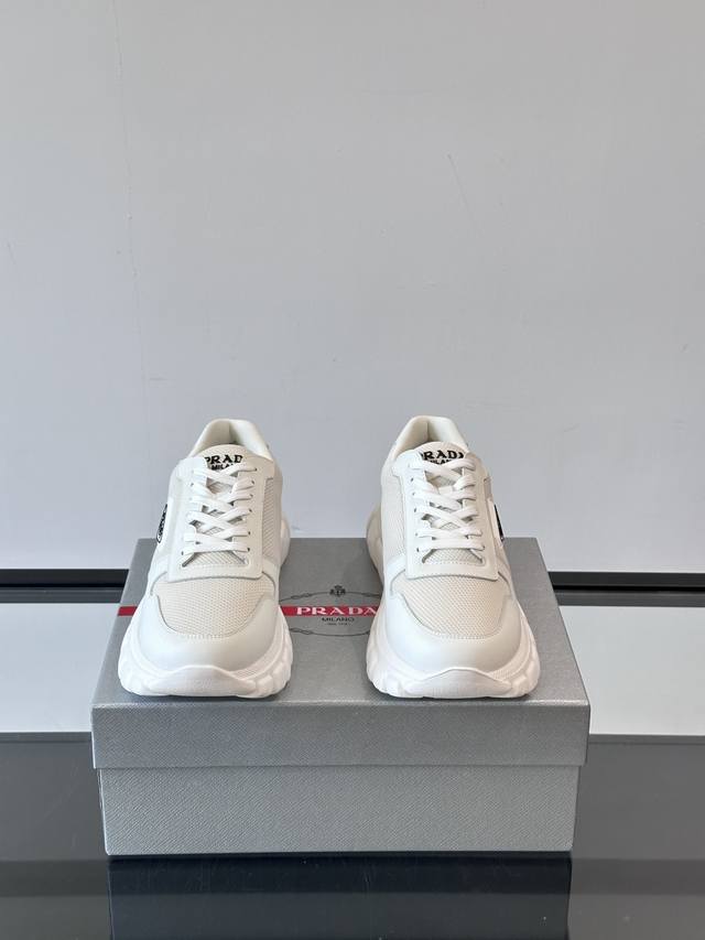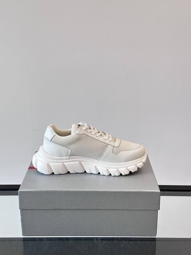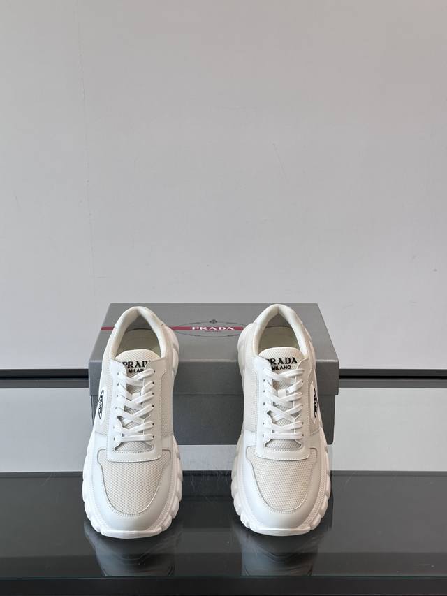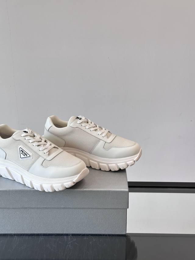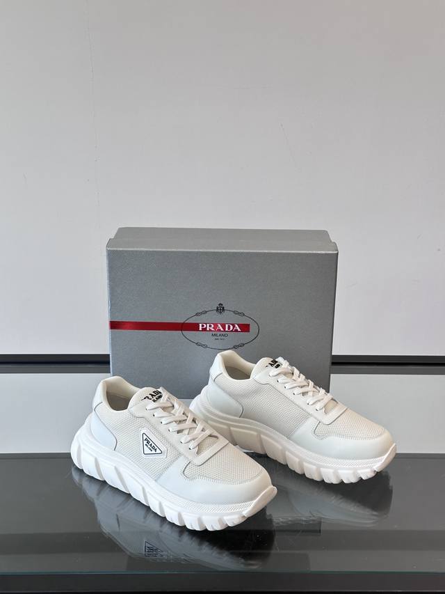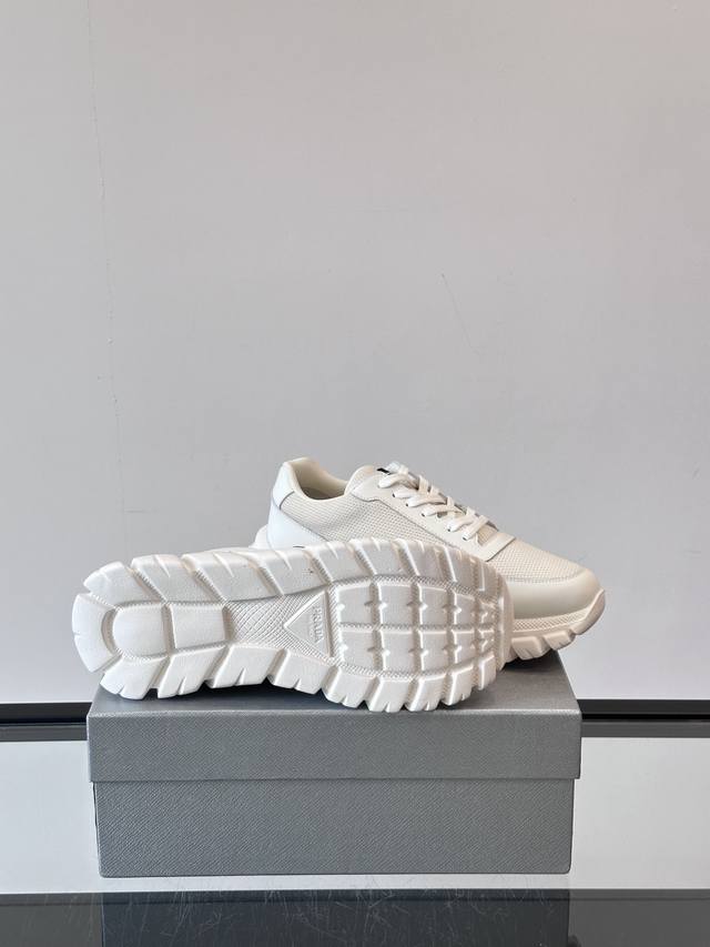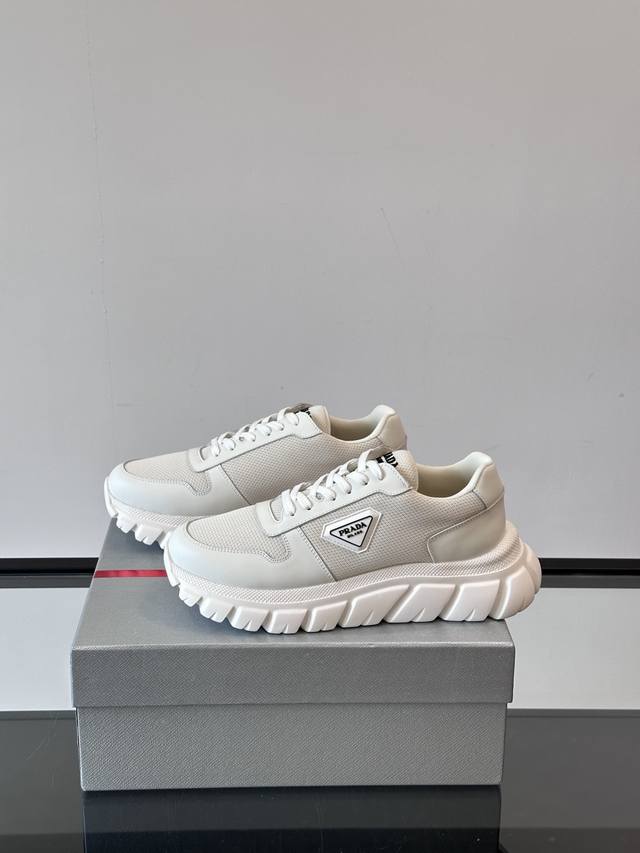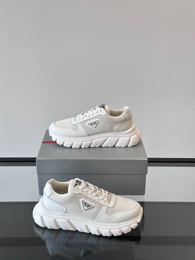 prad* 男士新款柔软皮革休闲运动鞋,这款运动鞋采用纳帕牛皮打造,皮质柔软细腻,纹理自然,提升透气性能,外侧橡胶三角形徽标点缀鞋身,鞋舌及后跟饰以品牌字母Logo细节,超轻质6Cm凹凸纹橡胶厚底,侧面配有prada字母徽标,牛皮内里,脚感舒适,精致百搭!