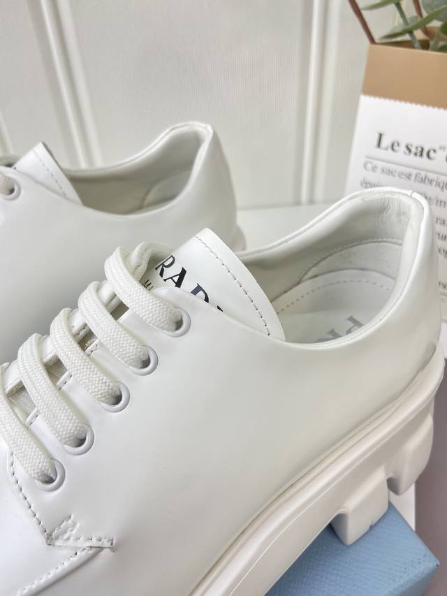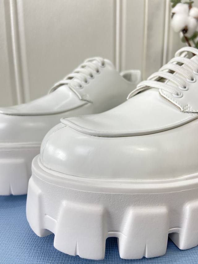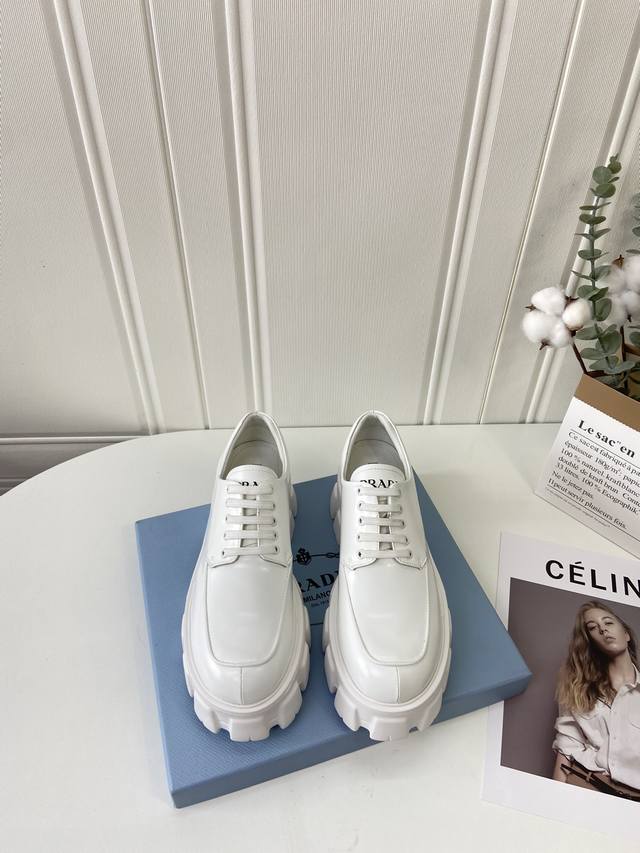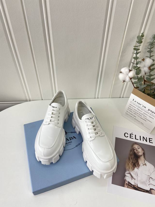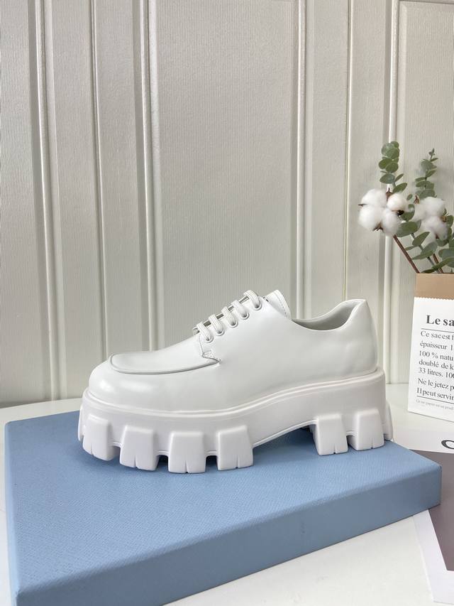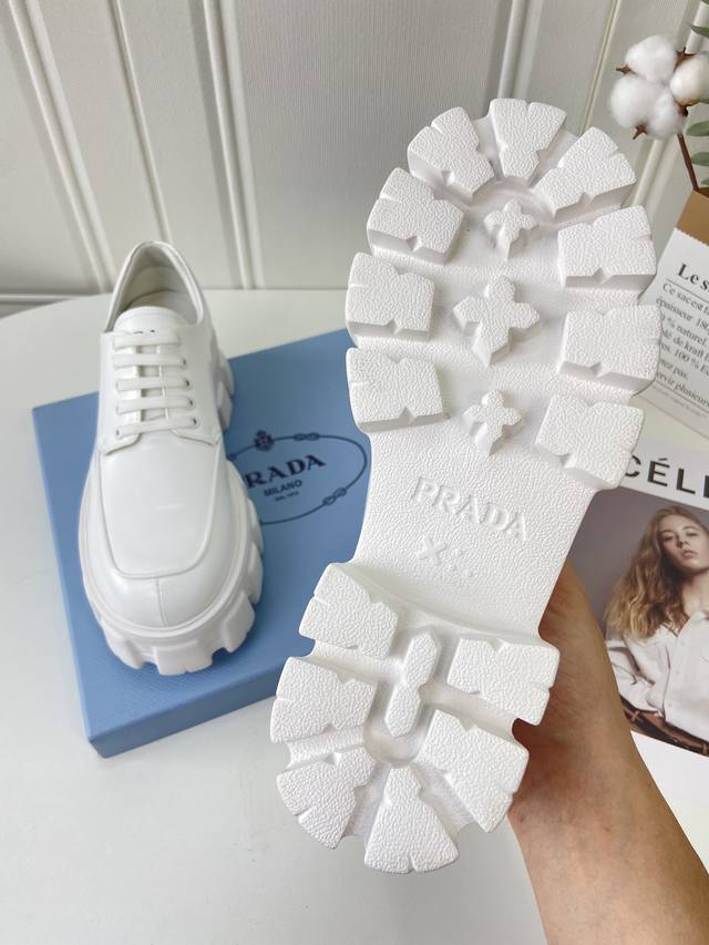 / prad* Ss22New Arrival~ p家 新款,专贵4月新品 经典的车轮厚底+经典的乐福鞋面 鞋底不重,脚感超级舒适,增高5.5Cm 鞋面开边珠牛皮,