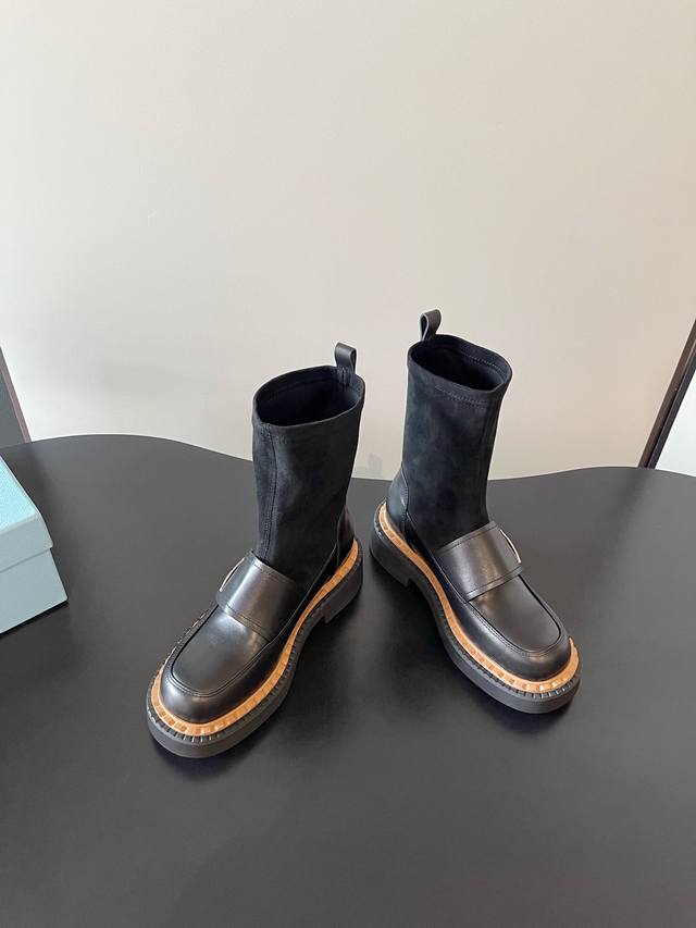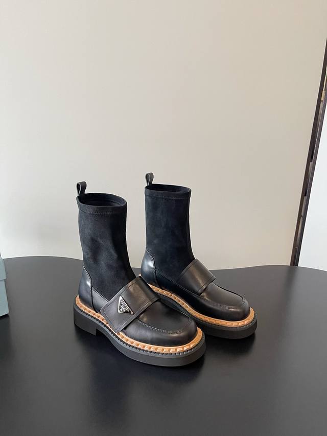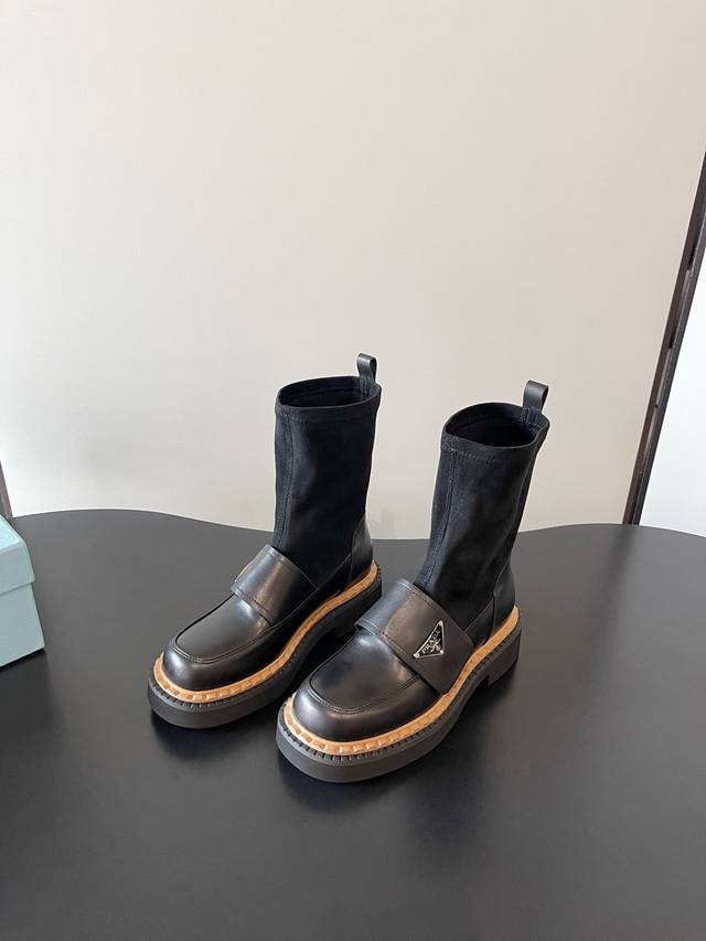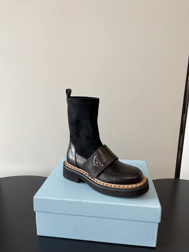 prada 最新弹力 厚底机车靴 包包时尚休闲机车马丁靴 独到味道 人人都爱也轻松驾驭 每年都会爆.还有就是经典的鞋楦 足以征服你 穿上它 增高休闲两不失误 脚简单帅气 !