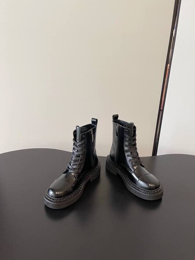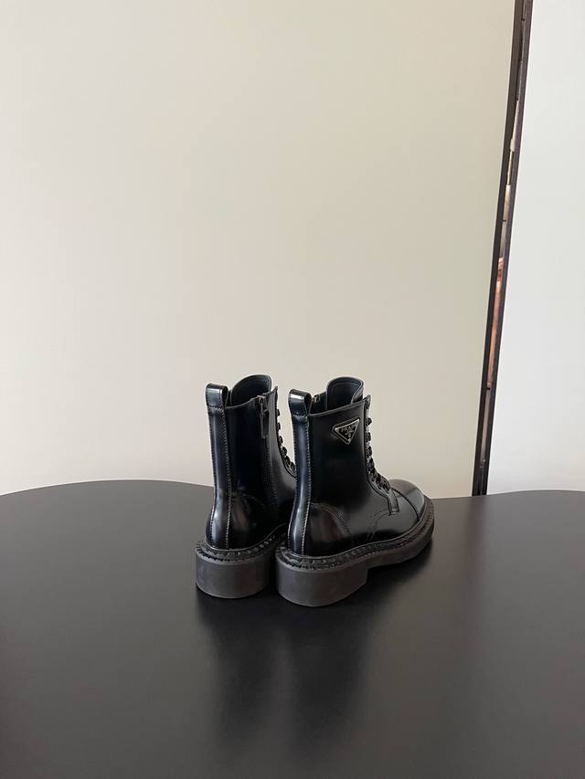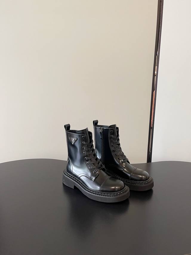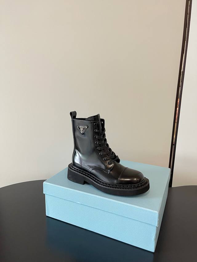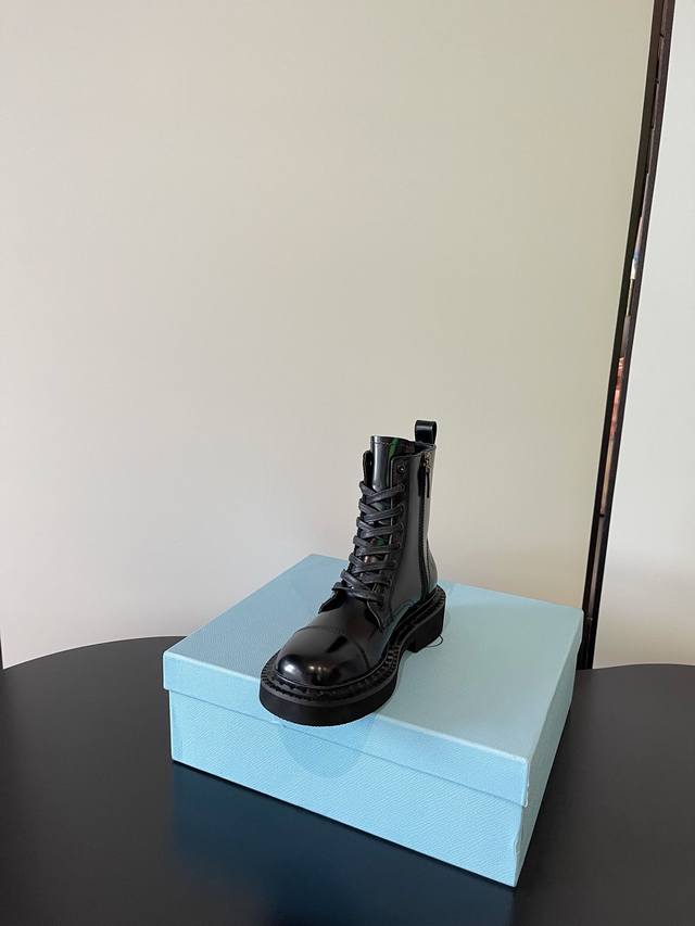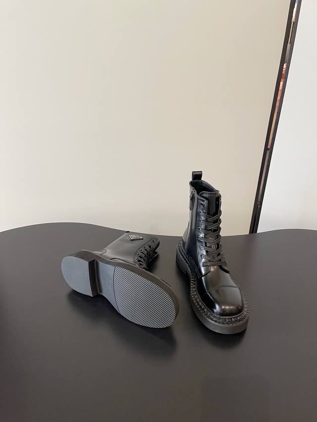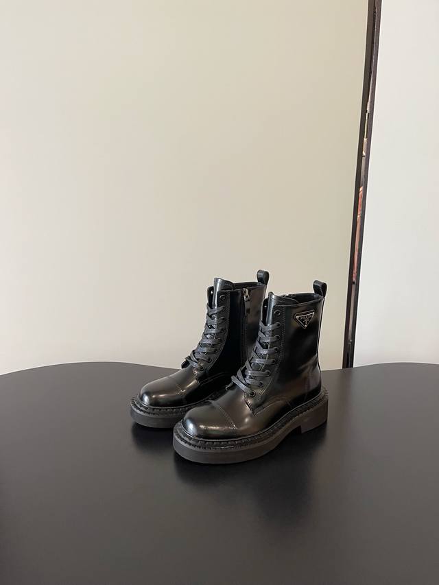 prada 最新系带马丁 桶靴 厚底机车靴 时尚休闲机车马丁靴 独到味道 人人都爱也轻松驾驭 每年都会爆.还有就是经典的鞋楦 足以征服你 穿上它 增高休闲两不失误 脚简单帅气 !