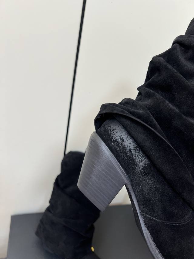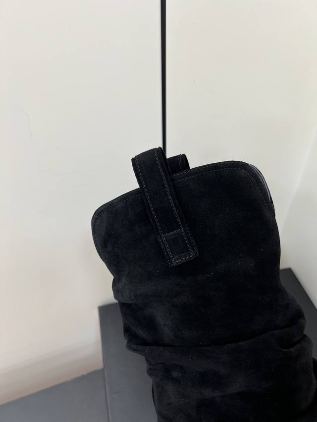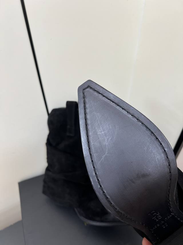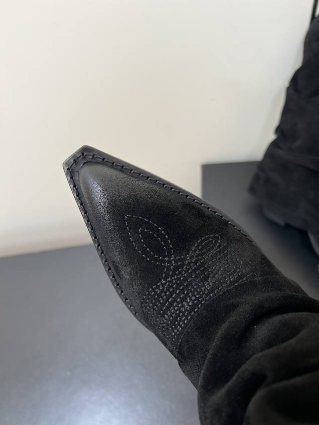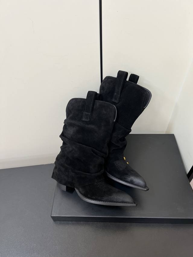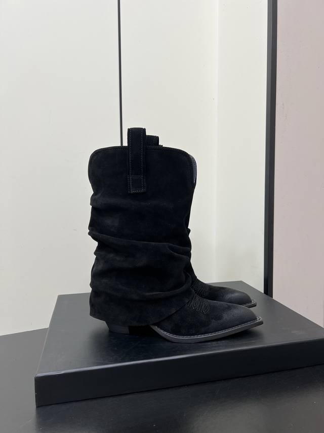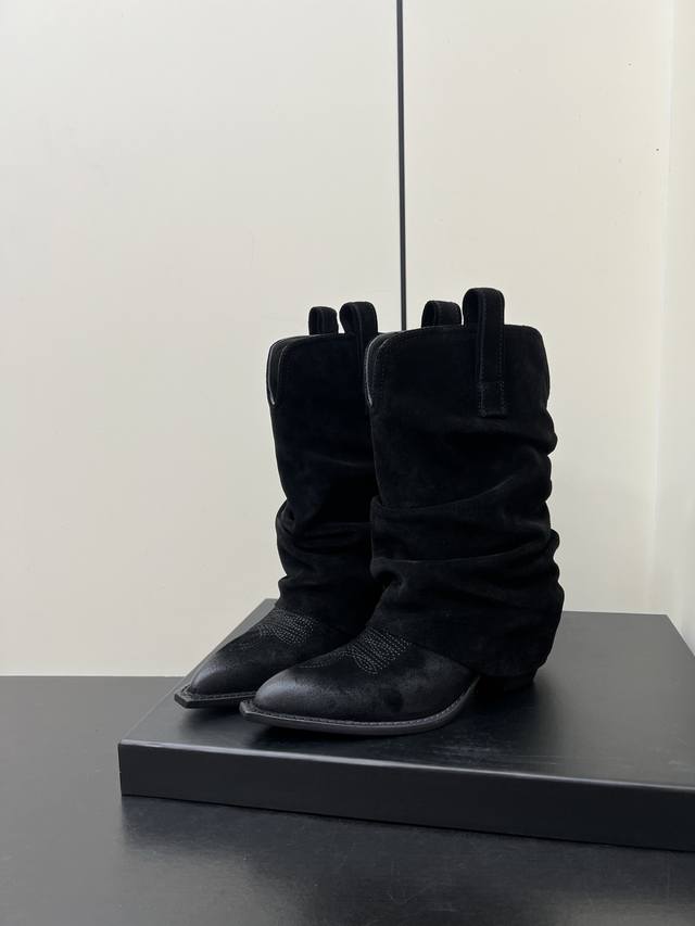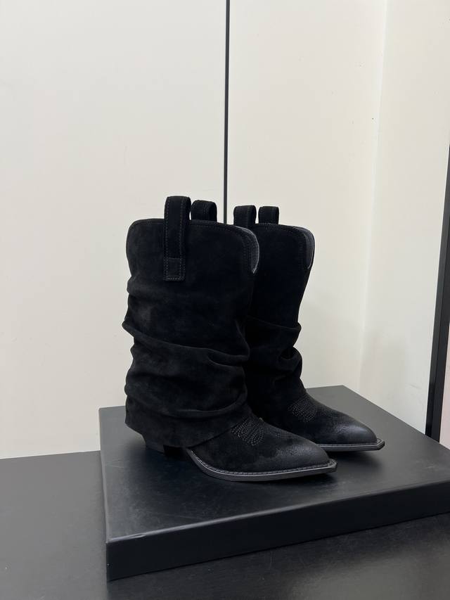 R13 这款西部靴 复古麂皮褶皱设计超吸睛 尖头造型拽酷拉满 上脚瞬间化身街头时髦精 轻松拿捏美式复古腔调~