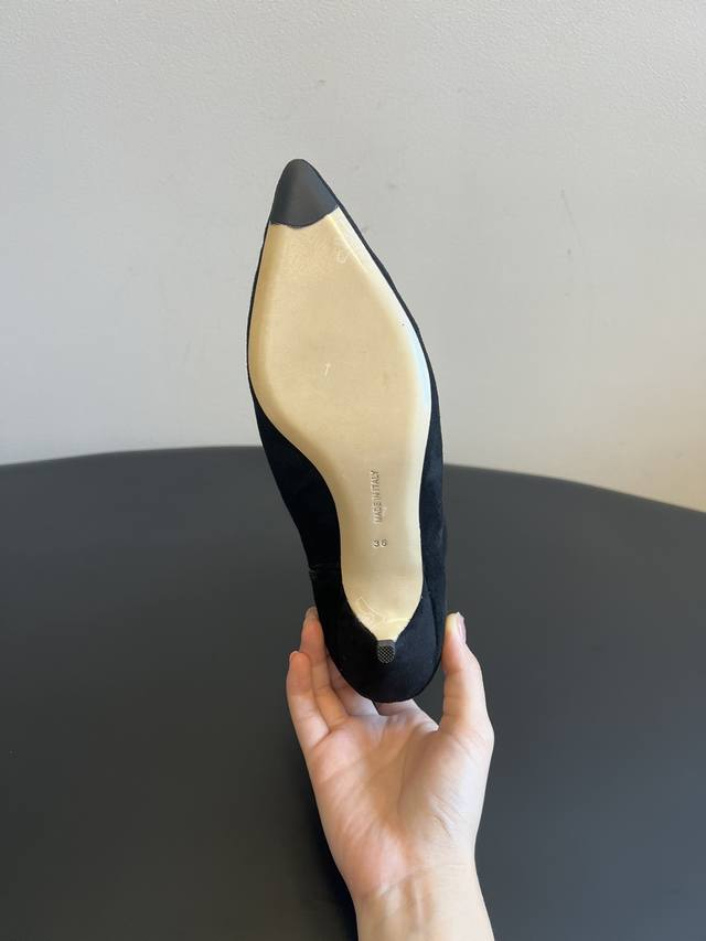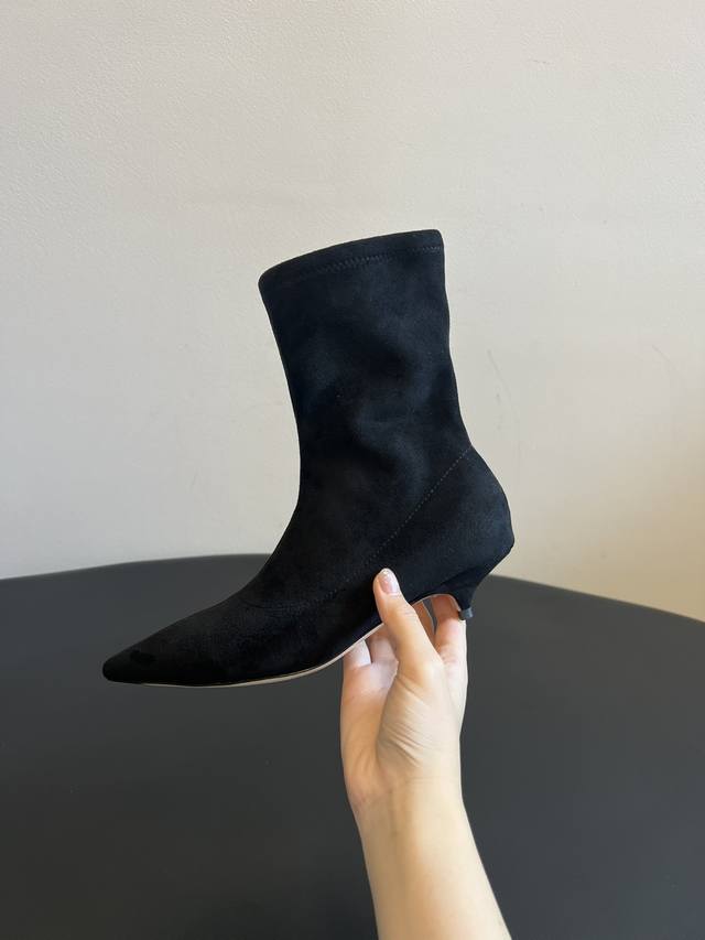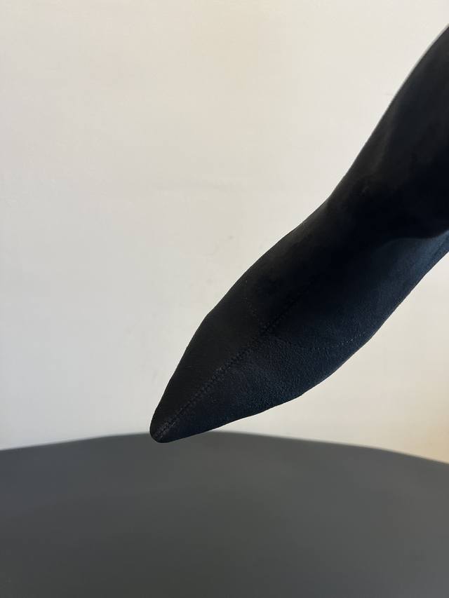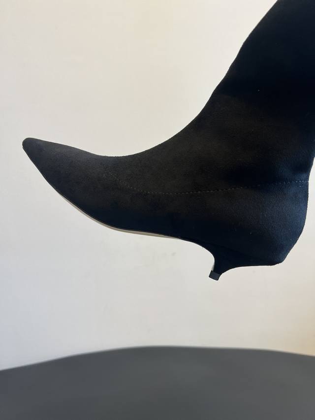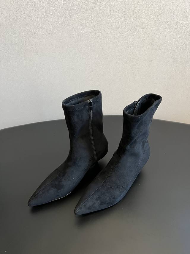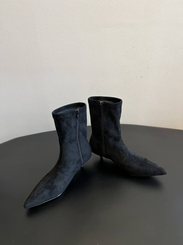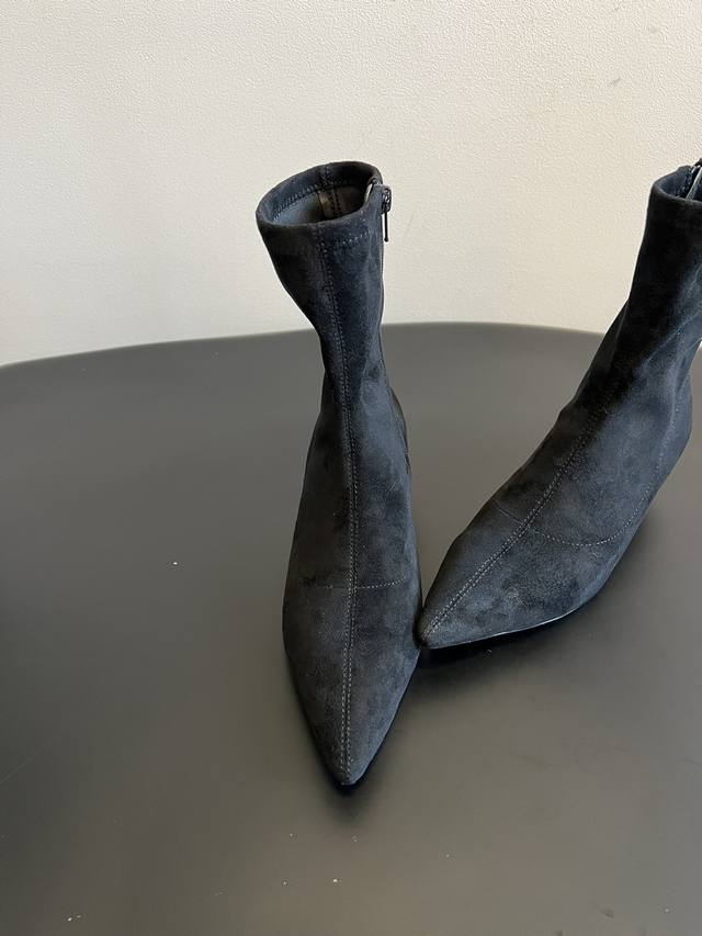 采用类似麂皮的材质,质感细腻。靴型是修身的短筒设计,侧边有拉链,方便穿脱,能很好地贴合脚踝线条。鞋头为尖头造型,增添了精致感;搭配细跟设计,提升了整体的优雅度与女性魅力。