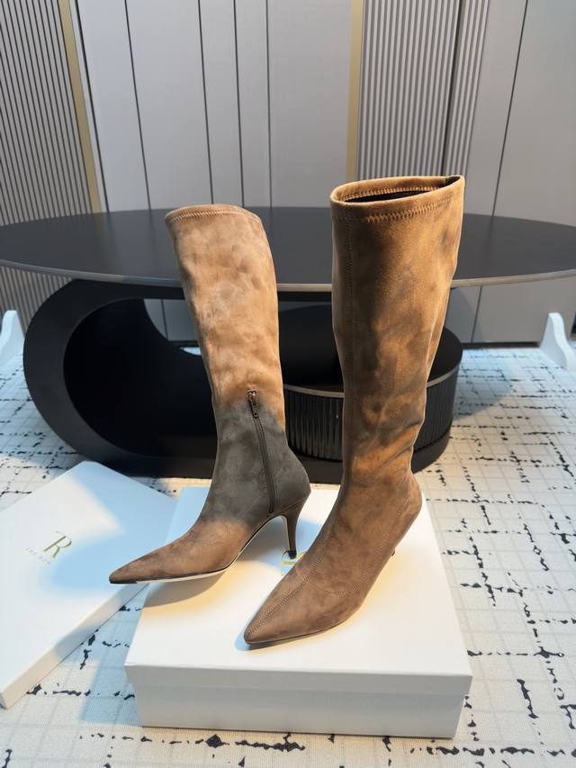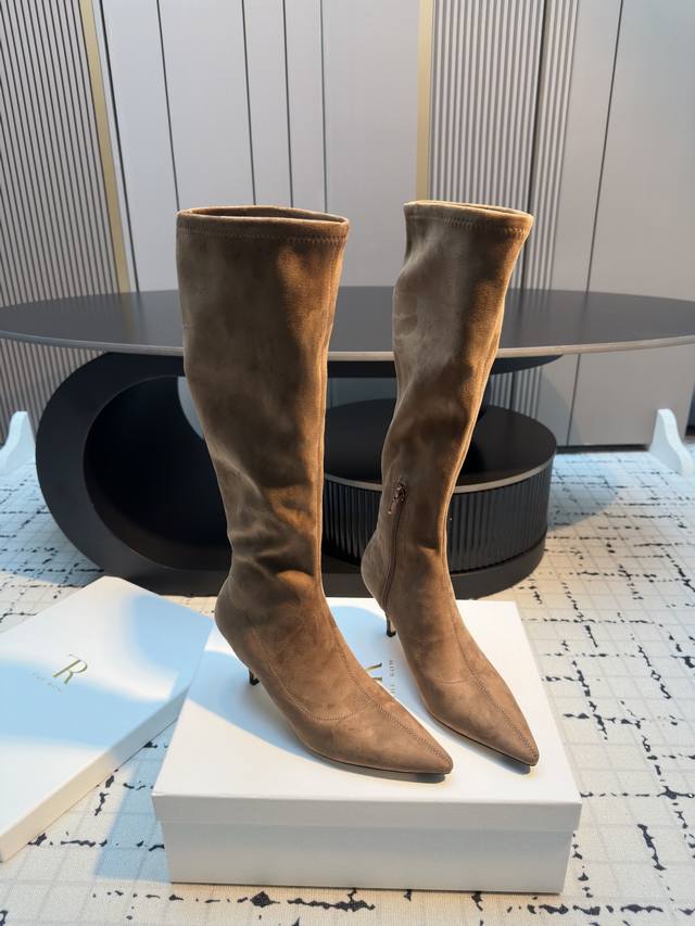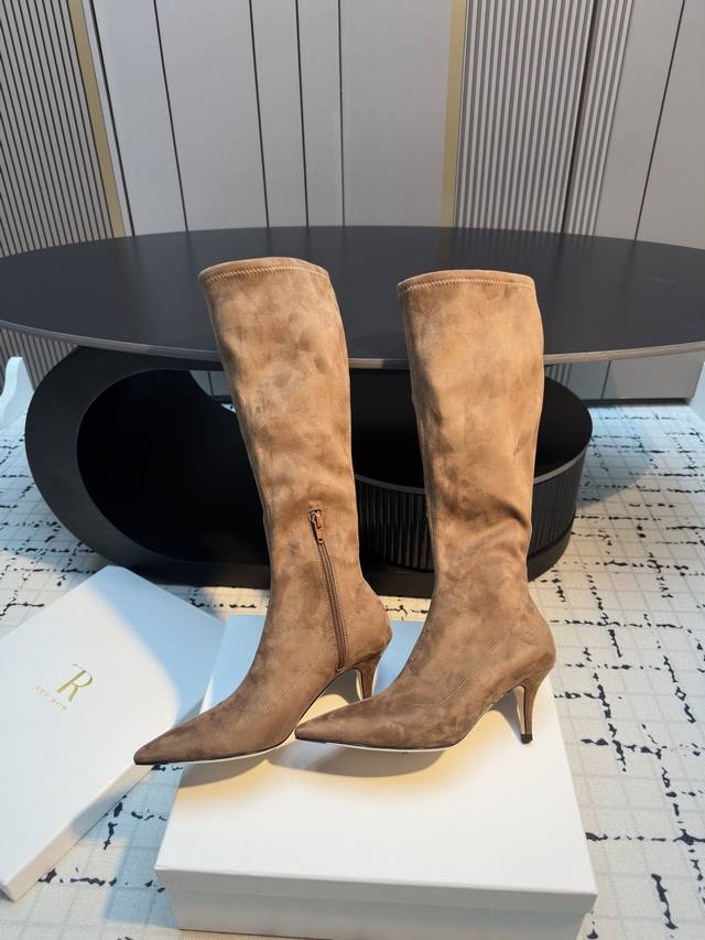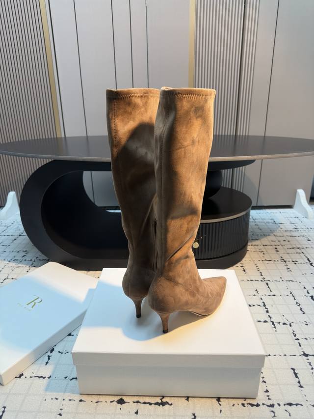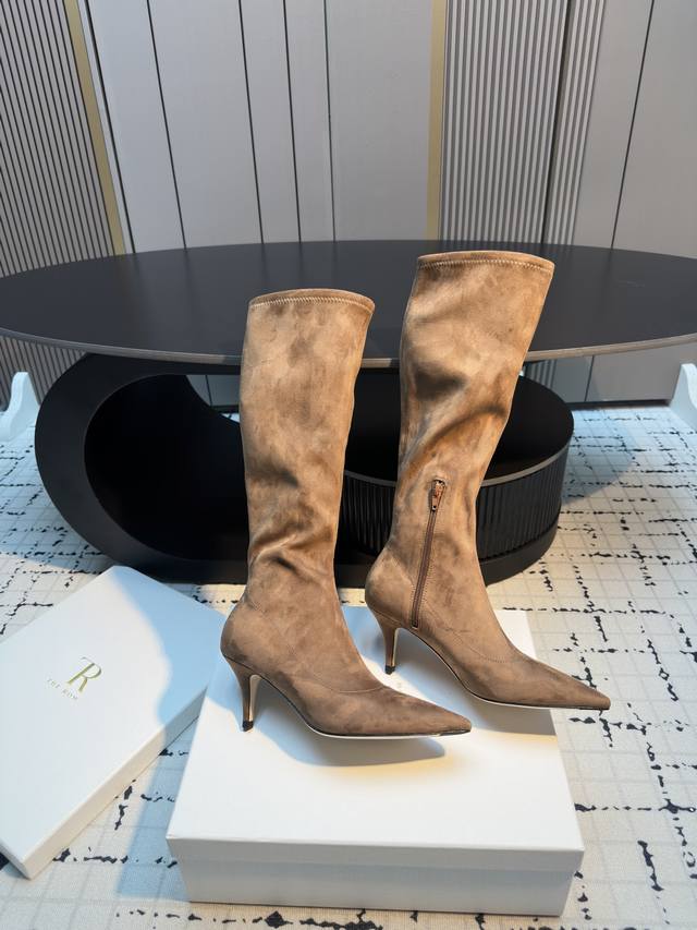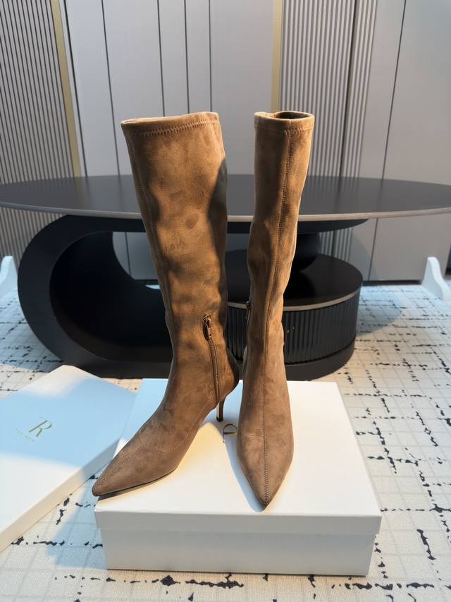 采用类似麂皮的材质,质感细腻。靴型是修身的短筒设计,侧边有拉链,方便穿脱,能很好地贴合脚踝线条。鞋头为尖头造型,增添了精致感;搭配细跟设计,提升了整体的优雅度与女性魅力。