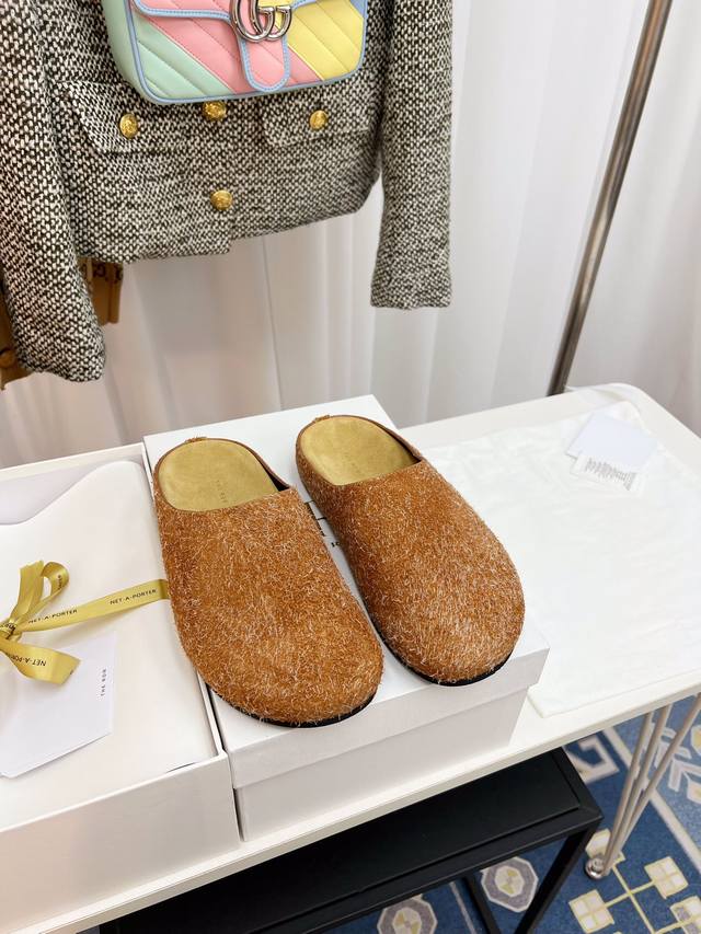 The Row 24新款包头拖 勃肯拖 复古味随意搭配都好看 一贯极简风格 没有任何logo点缀 简单即是高级 这款绝对是时髦女性的必备单品 鞋面:雪花牛反绒