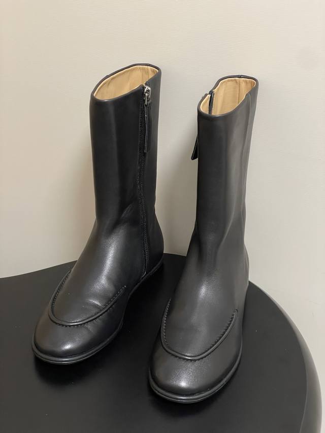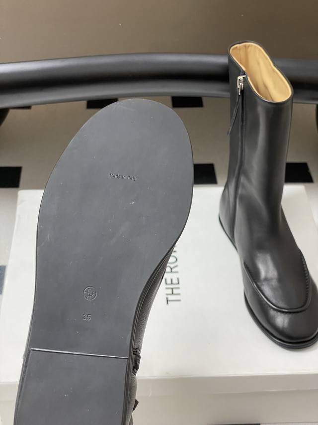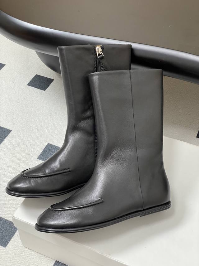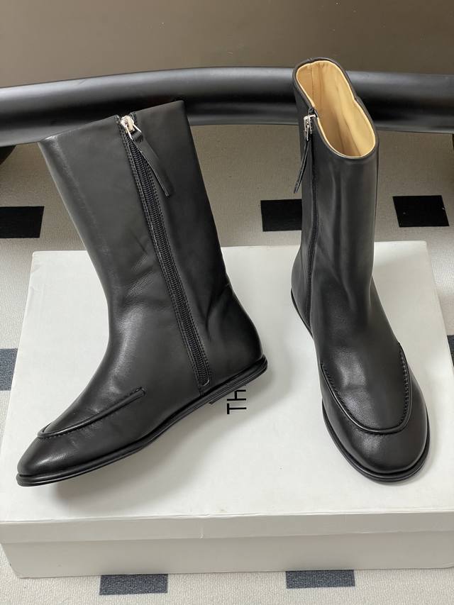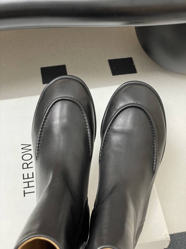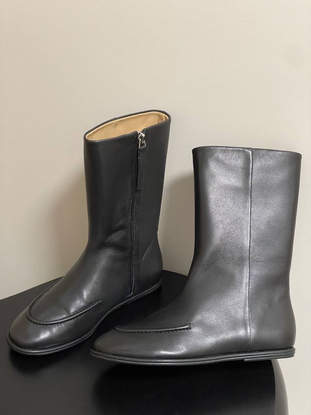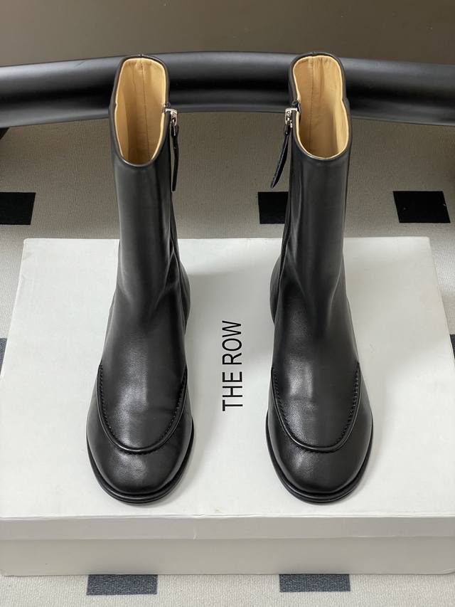The Row 25Ss秋冬新款 Tr极简风圆头平底短靴侧拉链中筒靴