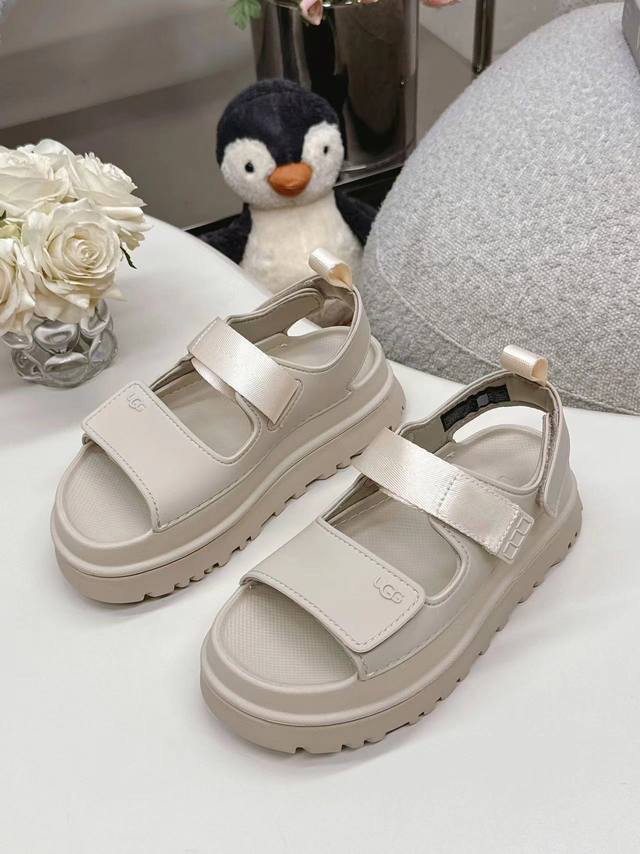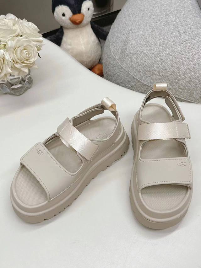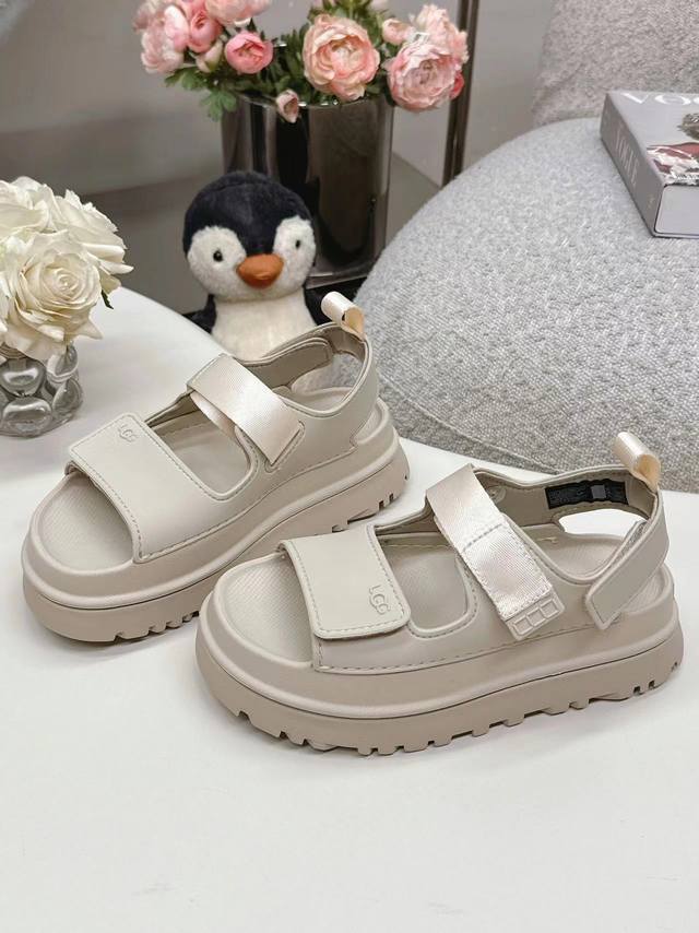 ugg厚底魔术贴凉鞋炫金多巴胺色系,绑带设计 更贴合脚背 活力感拉满,真嘟超级少女~一眼沦陷, Eva大底,脚感软糯舒适,百搭,秒变大长腿,可以踩水又能 Diy