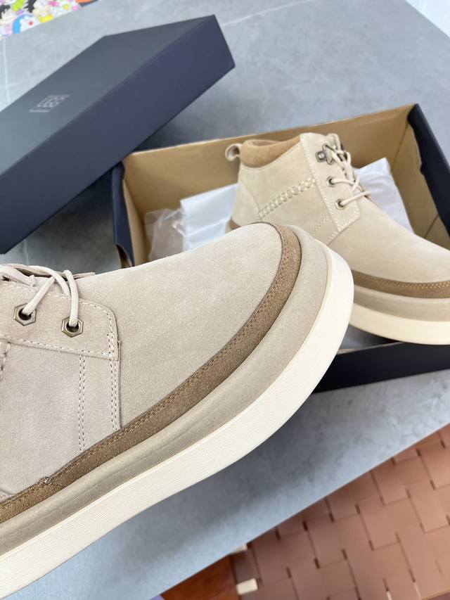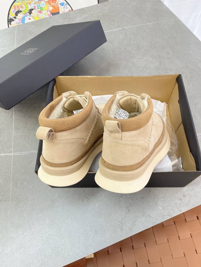 鞋面采用高品质丝光牛翻毛,简约的马克线缝饰为整体设计增添了一丝精致奢华。奢侈用料的翻毛皮包边尽显高端品味,每一个细节都经过精心打磨,保证产品在视觉上无可挑剔!经典的系带穿脱式设计,便于日常穿脱的同时,确保每一步的稳固感。内里选用天然羊皮毛一体,具有出色的保暖性能,在寒冷的季节中也能享受如入春日的温暖。羊皮毛材质具有良好的透气性,提供绝佳的舒适感,确保长时间穿着依然干爽不