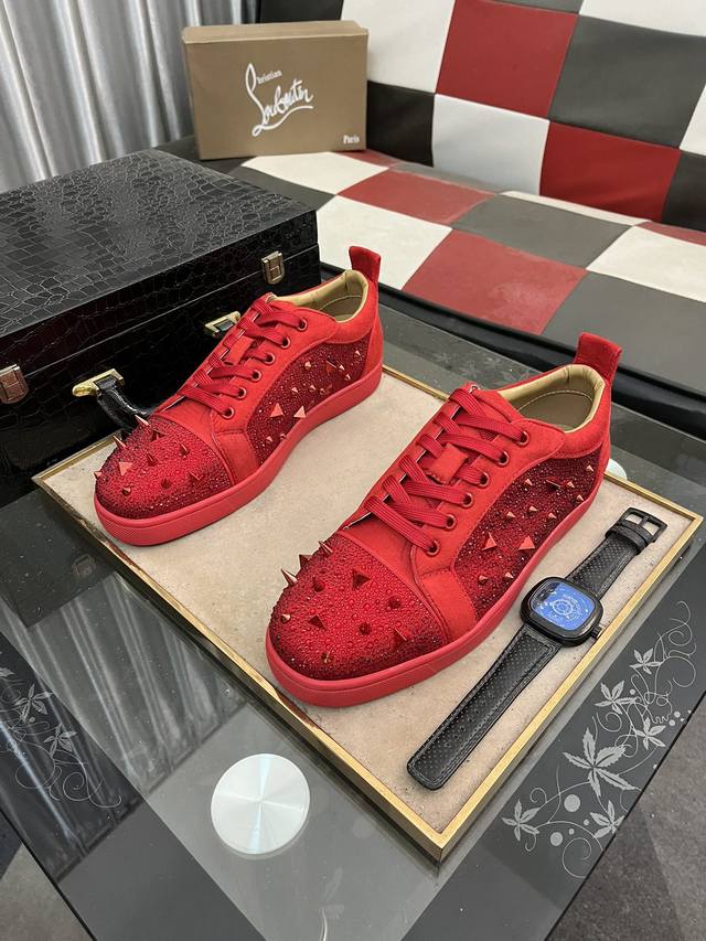 / 出厂价: Christian Louboutin Cl红底鞋 专柜烫钻系列,休闲板鞋 独家热款发布活动乳胶垫脚成品大底车线全球供货 顶级版 :原版进口牛皮鞋面,