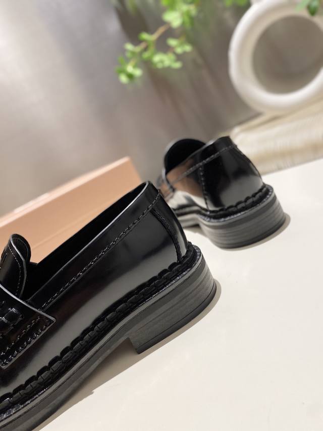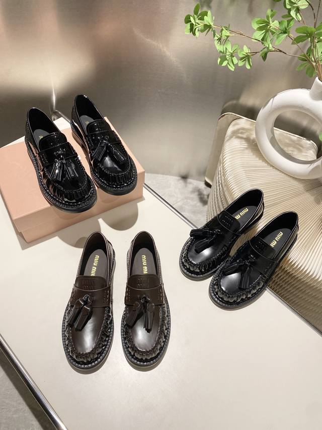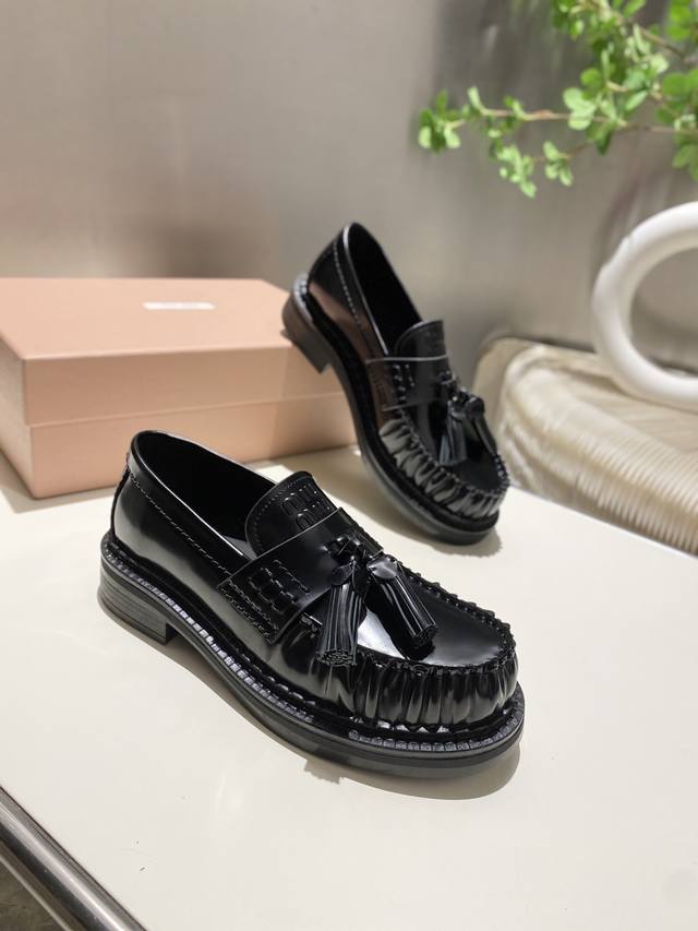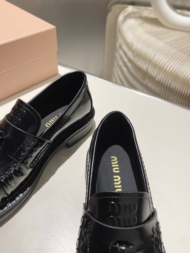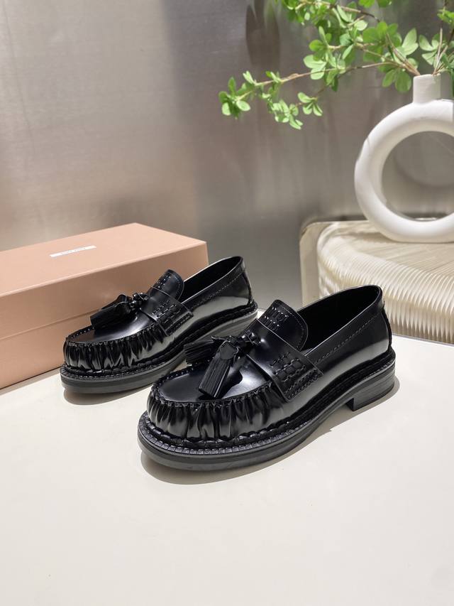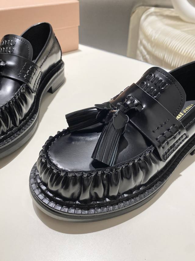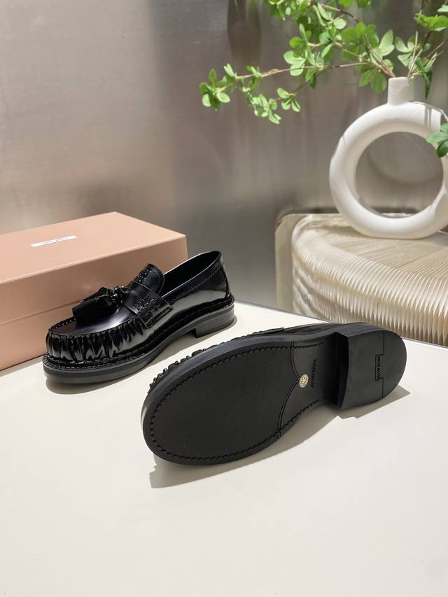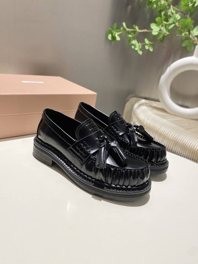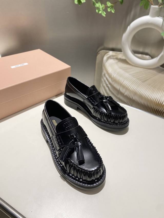 出厂价p 缪缪2025走秀新款 流苏饰机车鞋一脚蹬乐福鞋小皮鞋休闲鞋