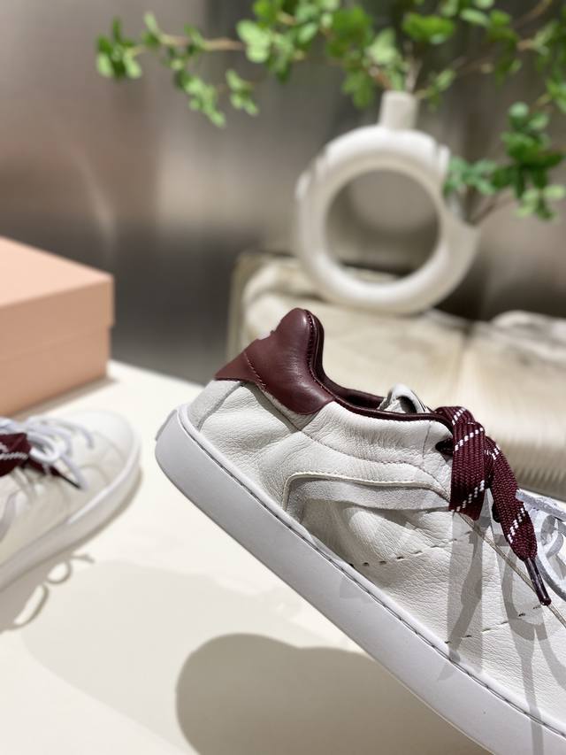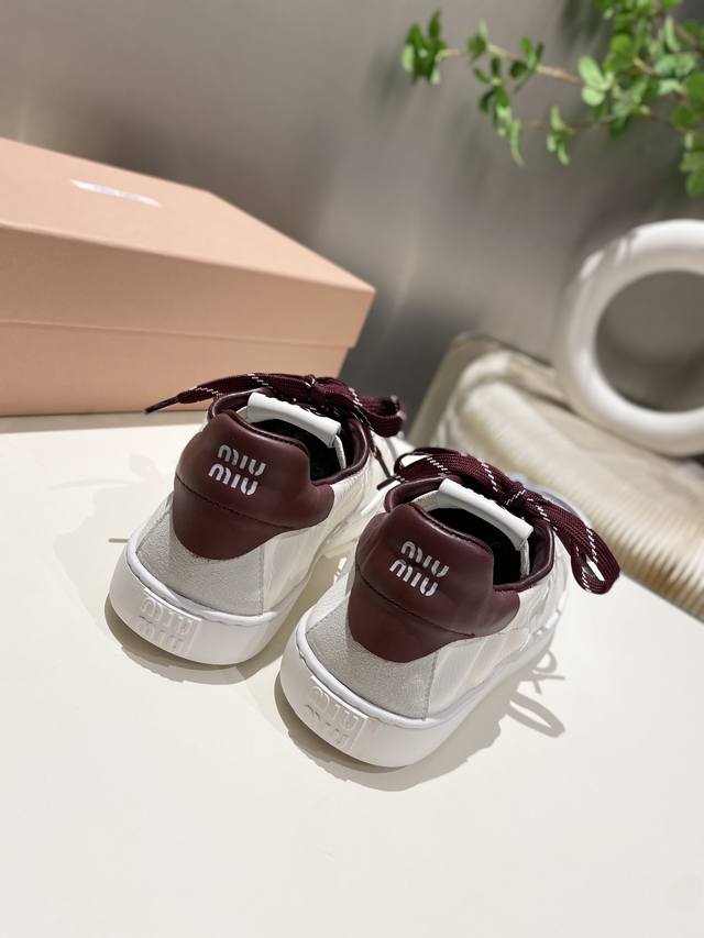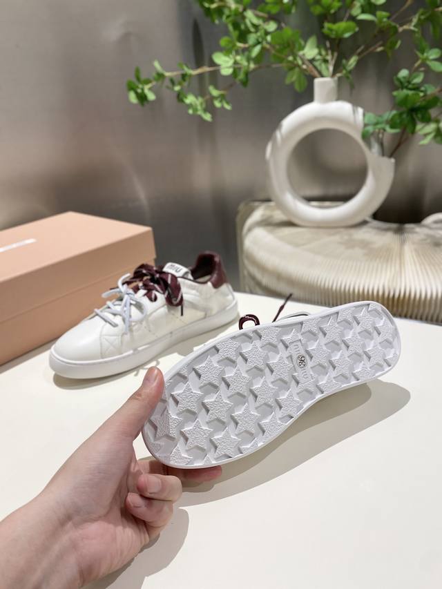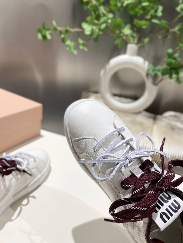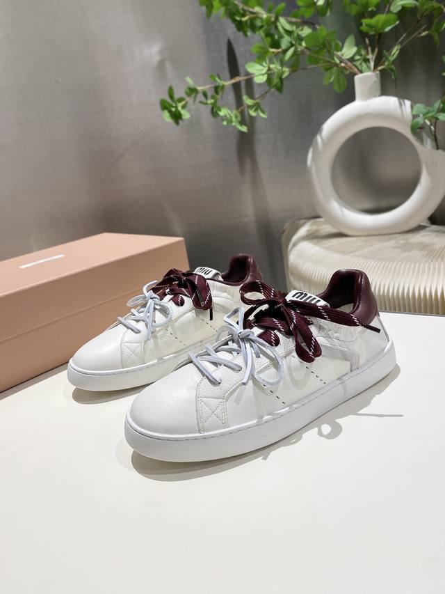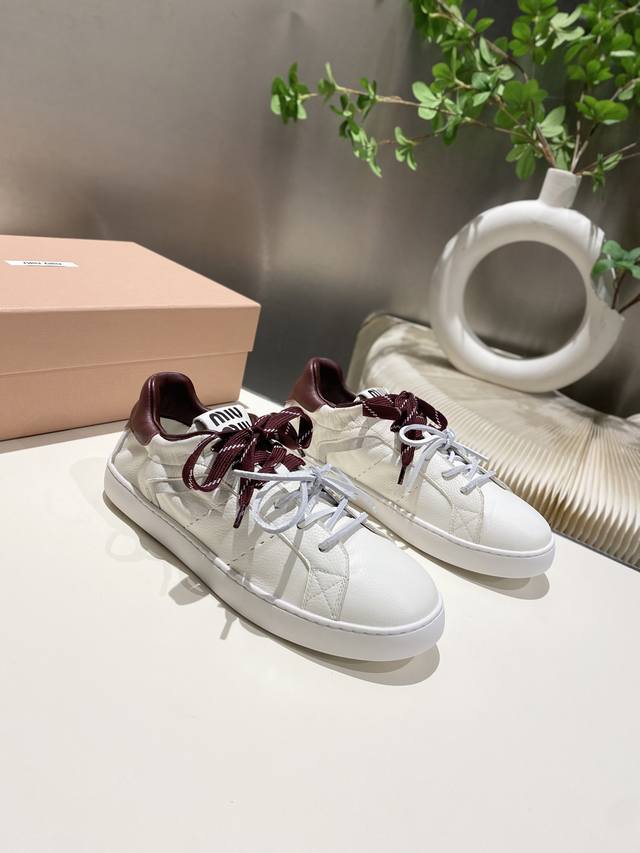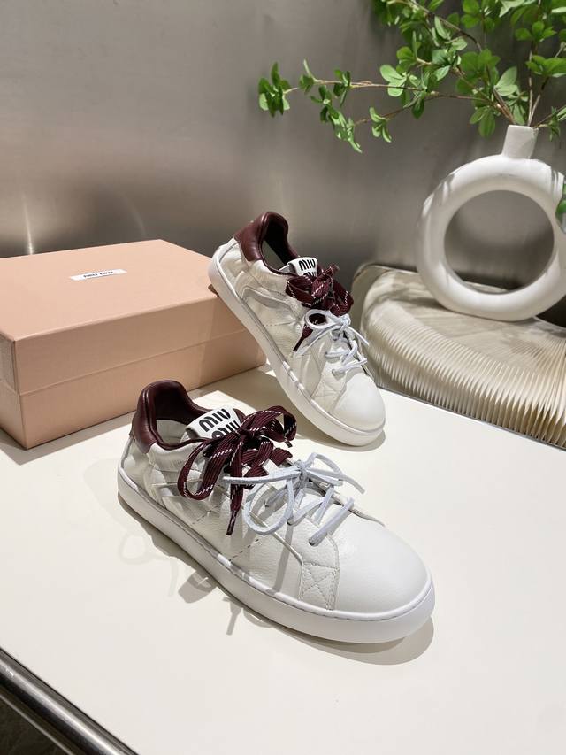 / 出厂 缪缪2025春夏新款 休闲小白鞋上新,官网主推款 简约的格板设计 级具辨识度的鞋舌 上脚阳光 青春,随意搭配 长裙 短裙 短裤 休闲系列都能穿出与众不同的